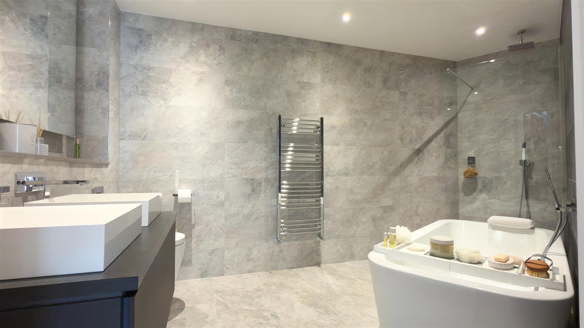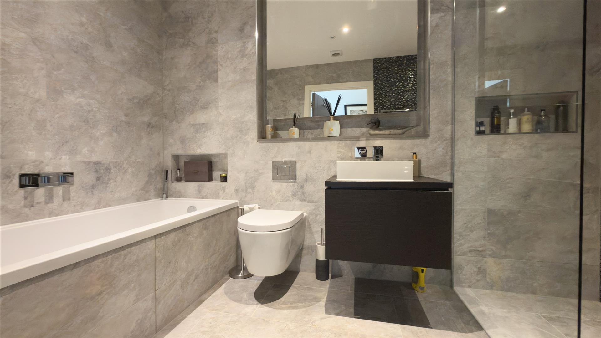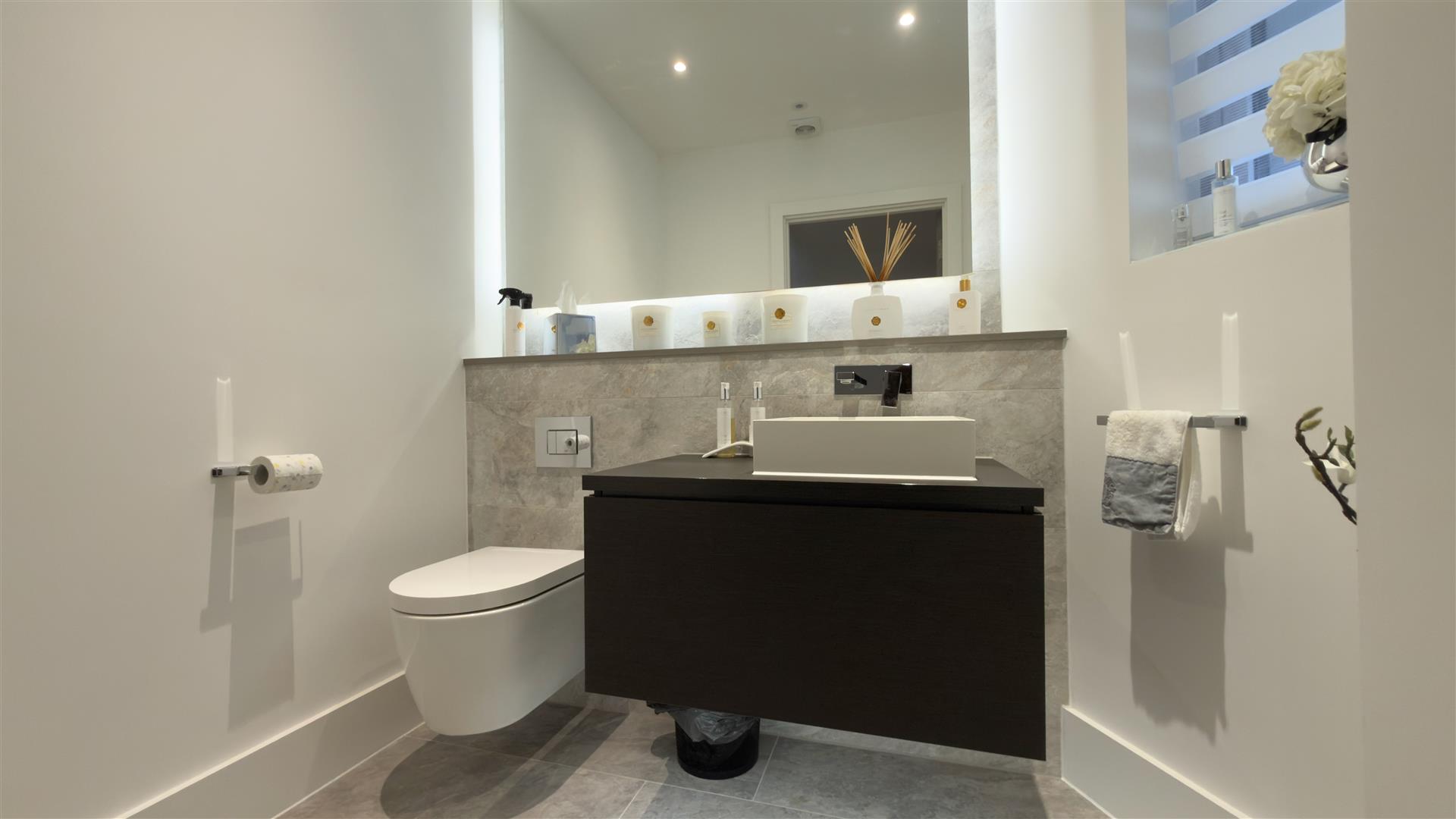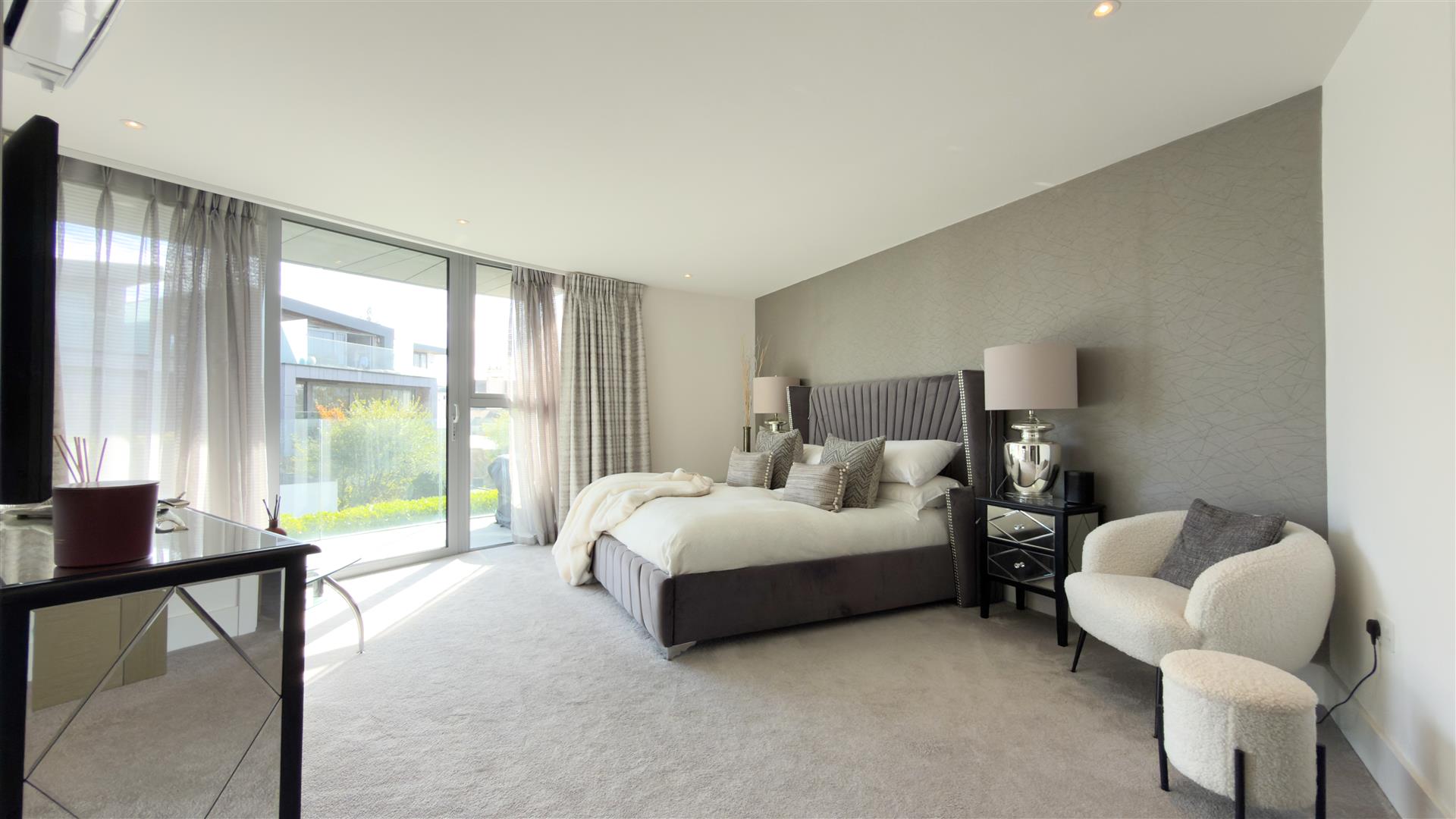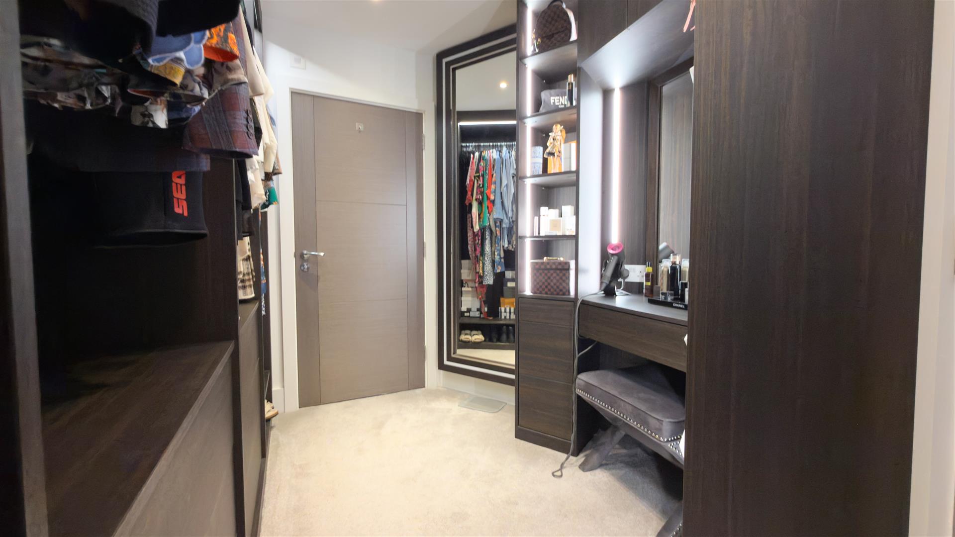 The apartment features a premium specification including a designer kitchen with stone worktops and integrated Miele appliances, elegant porcelain-tiled bathrooms, bespoke fitted wardrobes in the master suite, and CAT 6 wiring to principal rooms. Additional highlights include underfloor gas central heating, two secure parking spaces, and the balance of a 10-year structural warranty.
