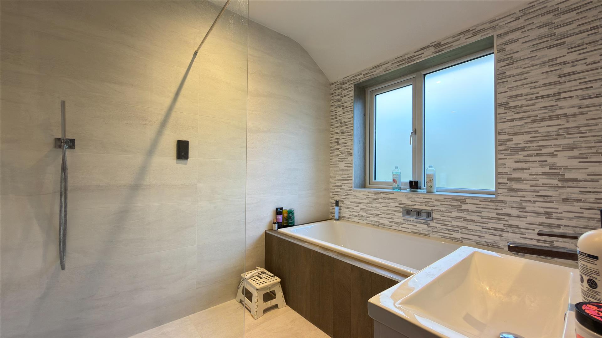 The house is around 2,500 sq ft, including a large integral garage. Upstairs there are four bedrooms and one bathroom. Downstairs you’ll find a sitting room, a spacious kitchen/diner and an extra room that works well as a snug or study. There’s also a small garden pavilion that can be used for a range of purposes.