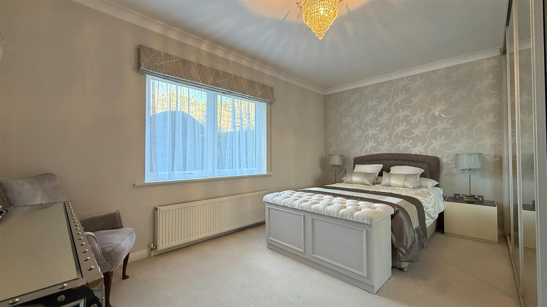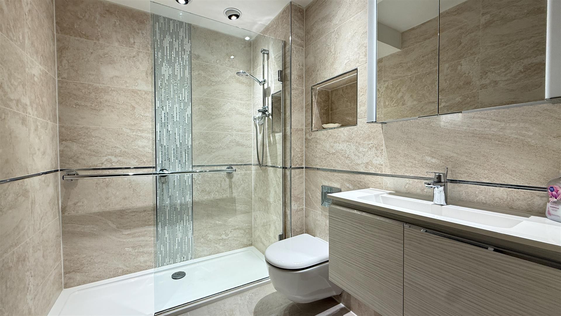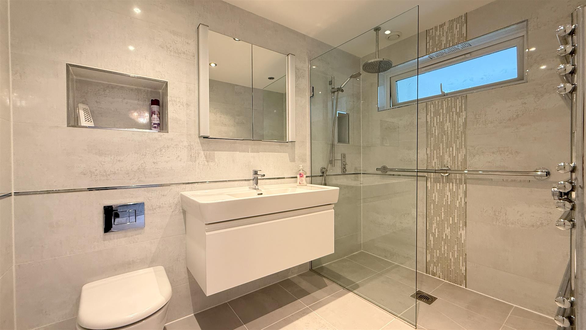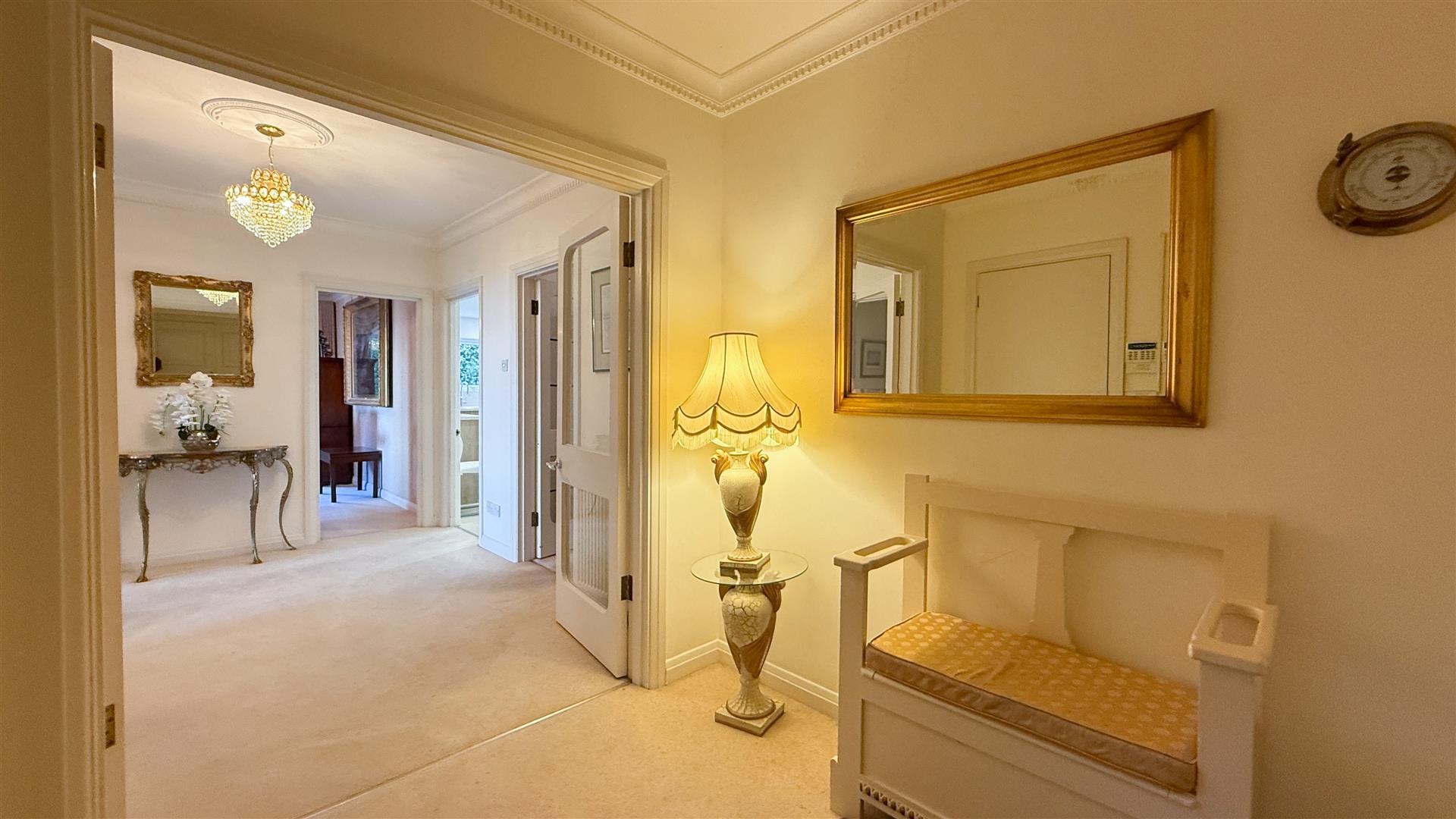The Inner hallway leads to the 3 double bedrooms, family bathroom and cloaks cupboard. The impressive master bedroom suite features fitted wardrobes, remote electric curtain rails, a fully tiled luxury en-suite shower room fitted with rain shower, heated towel rail and under floor heating, the dressing area leads to patio doors giving access to the gardens. The spacious guest double bedroom also features fitted wardrobes. The third double bedroom has fitted furniture that can be used as a dressing table or as a home office. The family bathroom is fully tiled with a walk-in shower and under floor heating and a heated towel rail.