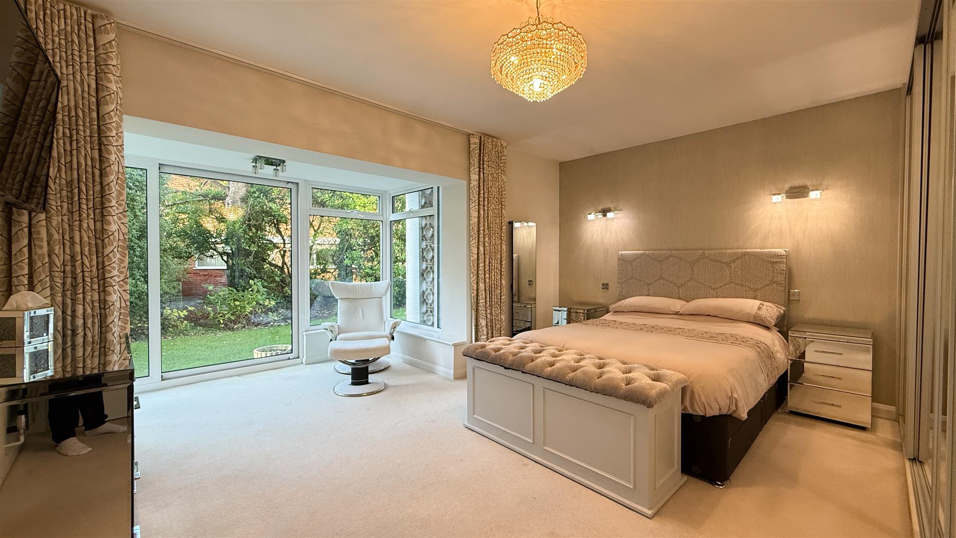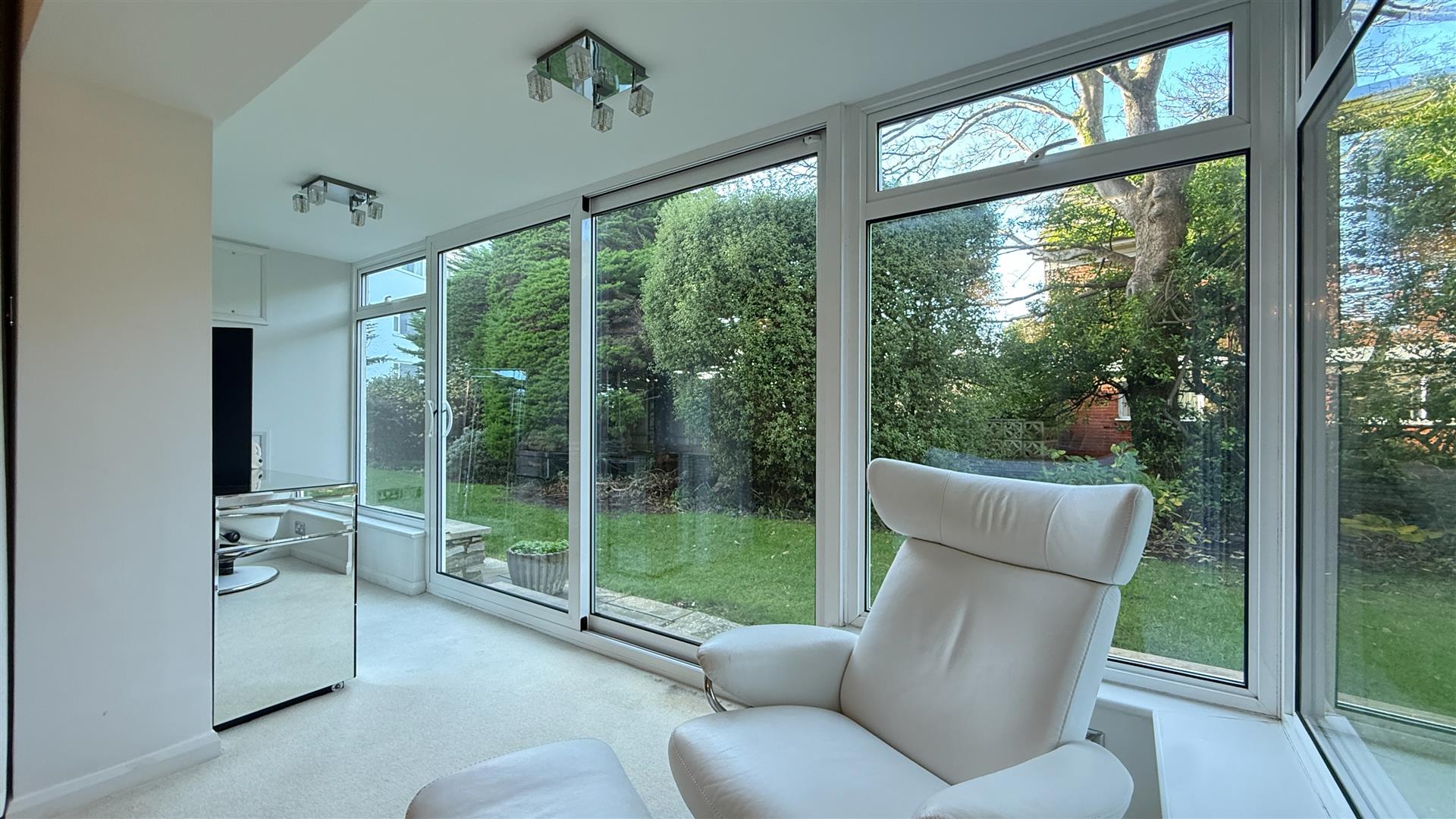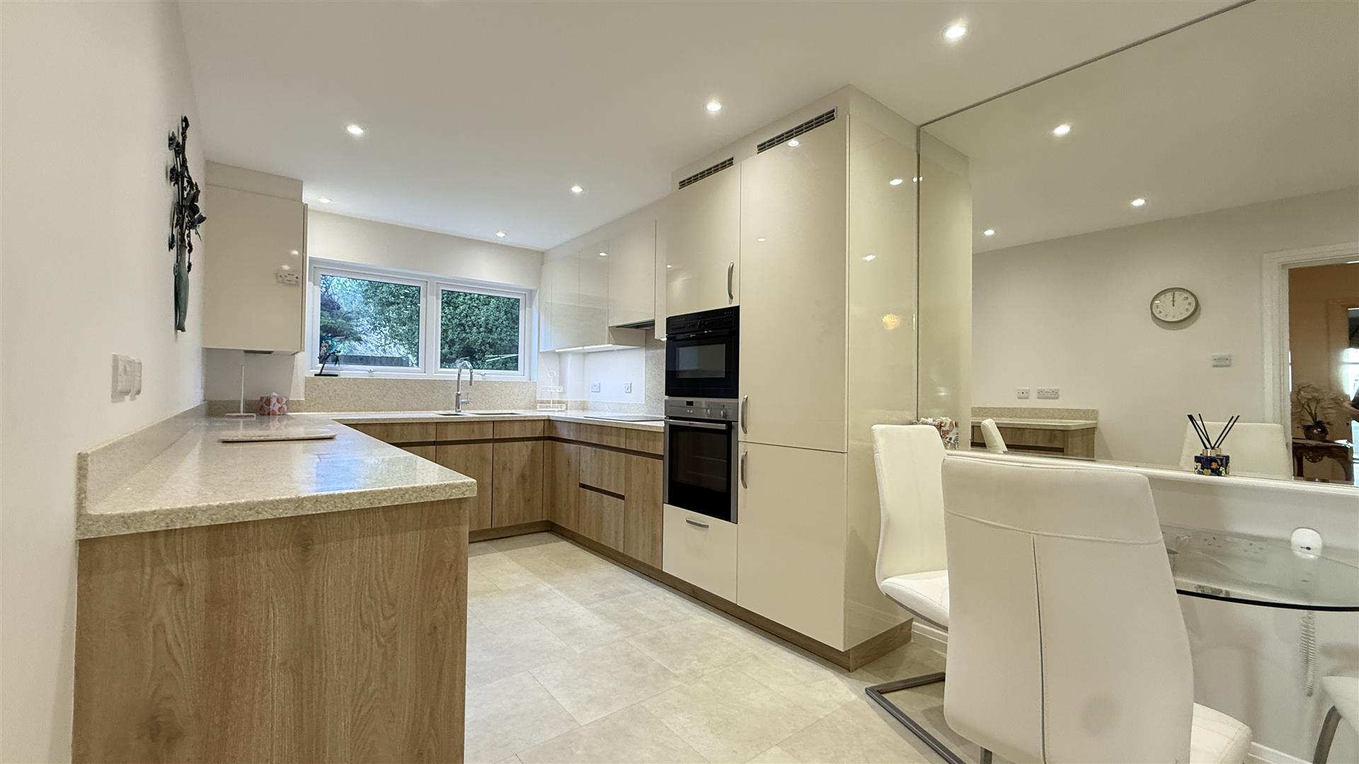The light and airy kitchen recently refurbished by Kitchen Elegance with Leicht units, features Neff integrated appliances including fridge, freezer, dish washer, double oven/microwave, induction hob, extractor fan, Quooker boiling water tap, Corian worktops and space for a breakfast table.