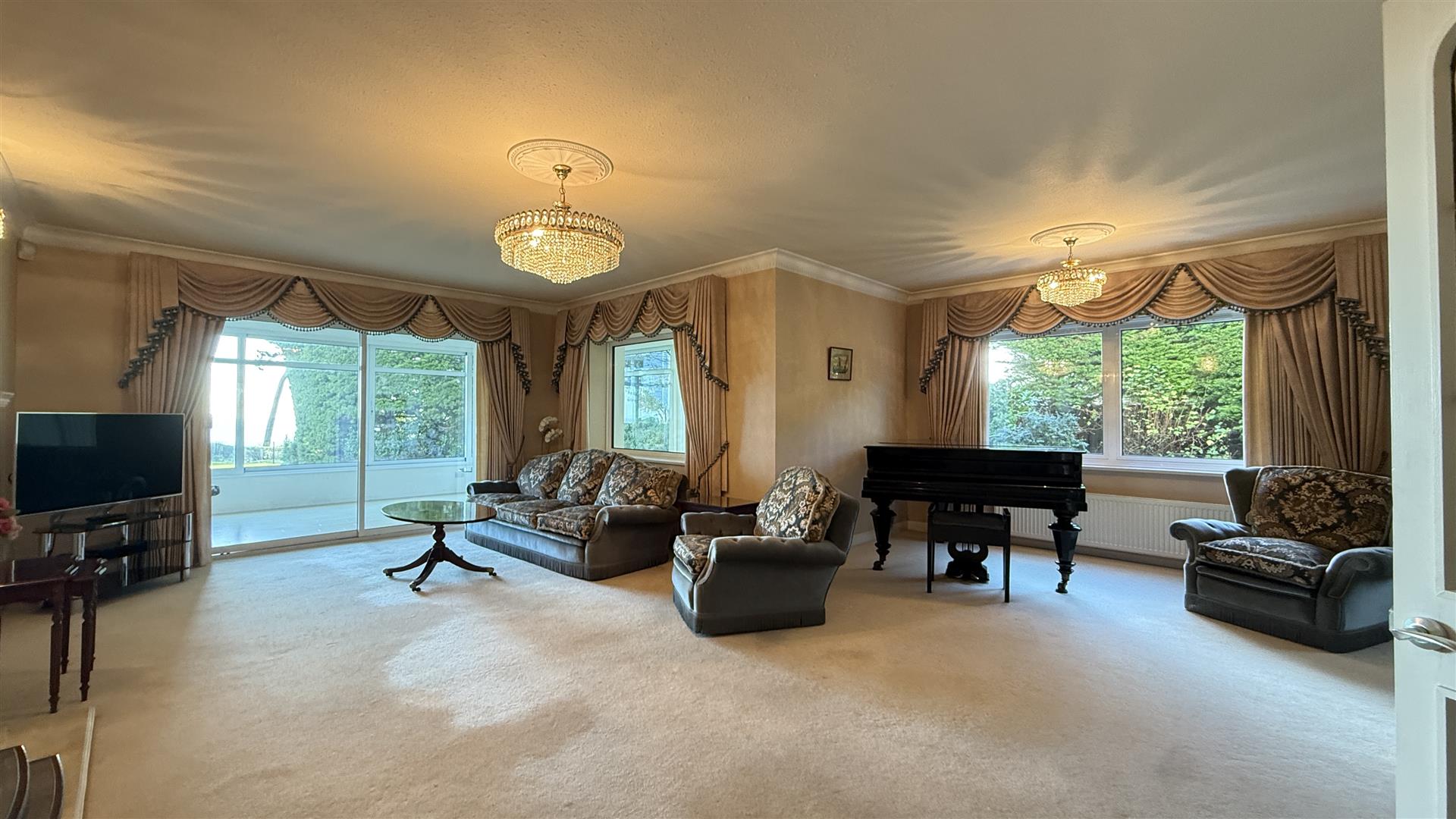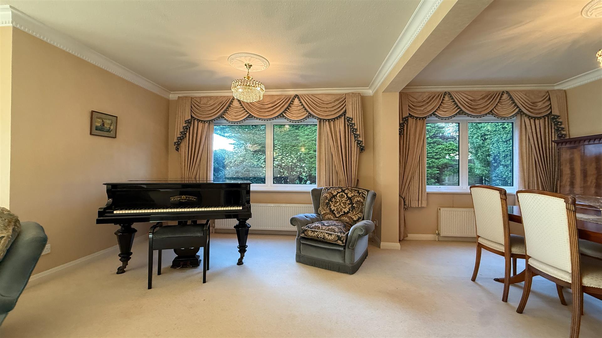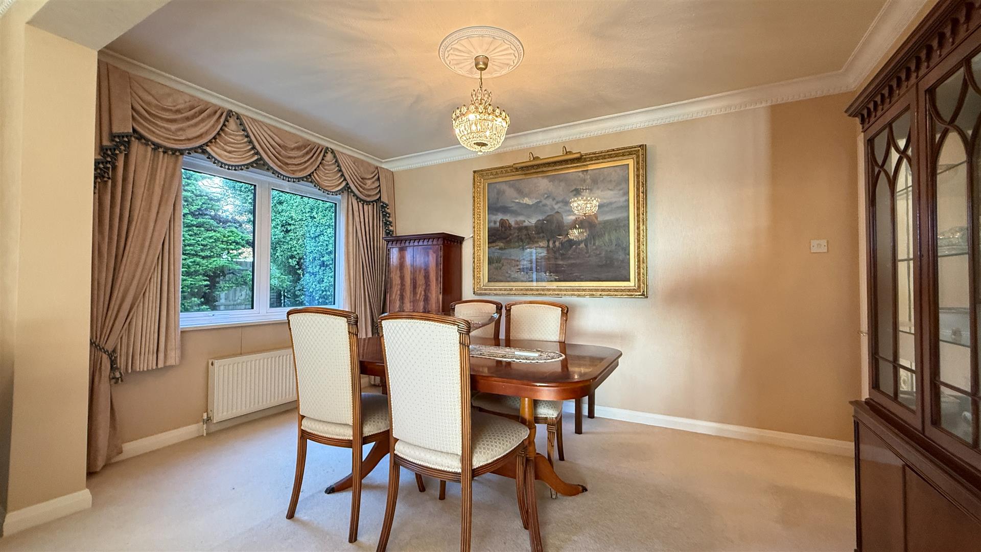 The light and airy kitchen recently refurbished by Kitchen Elegance with Leicht units, features Neff integrated appliances including fridge, freezer, dish washer, double oven/microwave, induction hob, extractor fan, Quooker boiling water tap, Corian worktops and space for a breakfast table.
