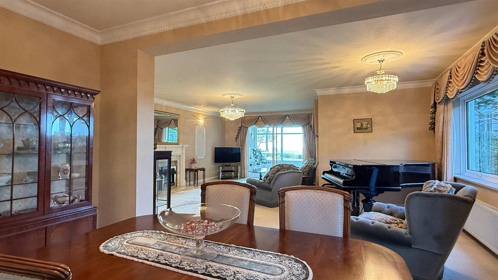 The spacious open plan lounge/dining area leads into the garden/sun room with large opening picture windows giving spectacular southerly views over the gardens and Poole Bay and is flooded with natural light, it also has the benefit of underfloor heating. There are also patio doors giving access to the landscaped communal gardens. Remote electric curtain rails are fitted to the lounge and dining room windows.