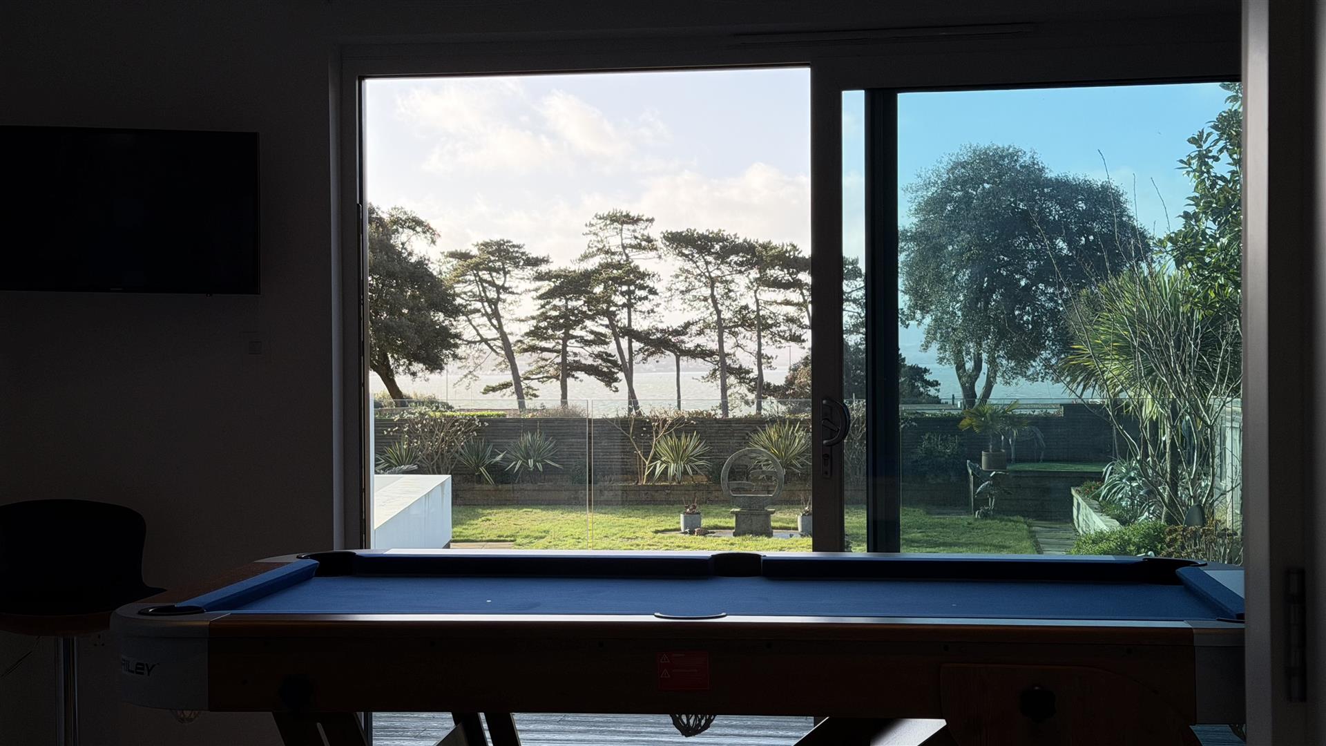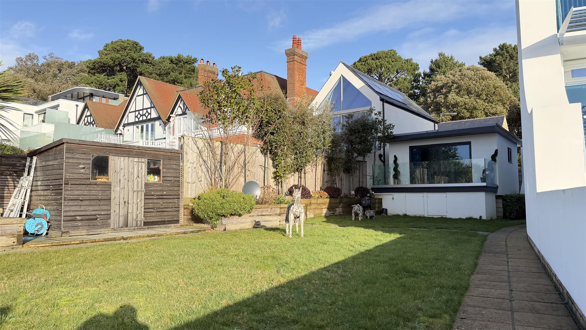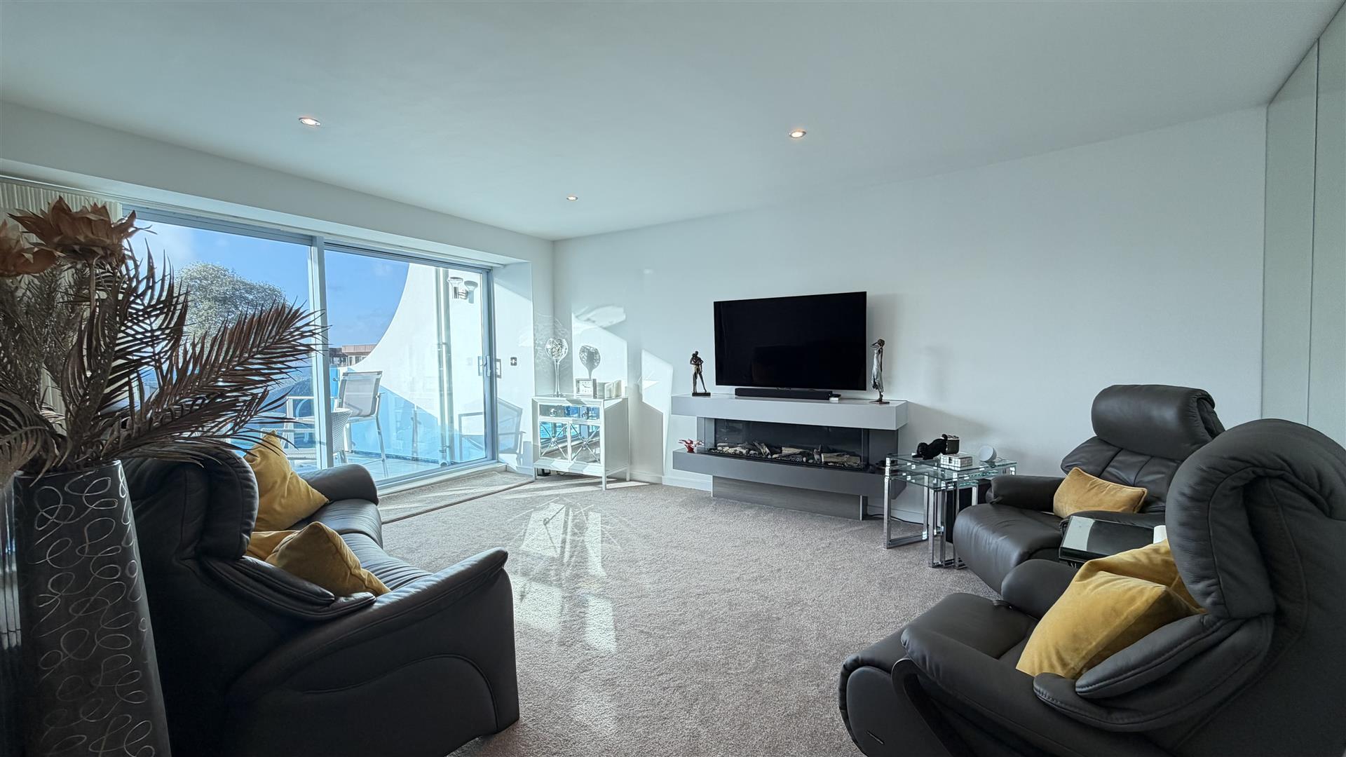 The first floor offers three further bedrooms, including a principal bedroom with en-suite bathroom, a family bathroom, and a spacious lounge with access to a balcony enjoying sea views. Externally, the property benefits from a large private garden, off-road parking and a separate garage. In addition, there is a detached games room / home office, complete with a kitchenette and offering flexible use as a workspace or hobby room.