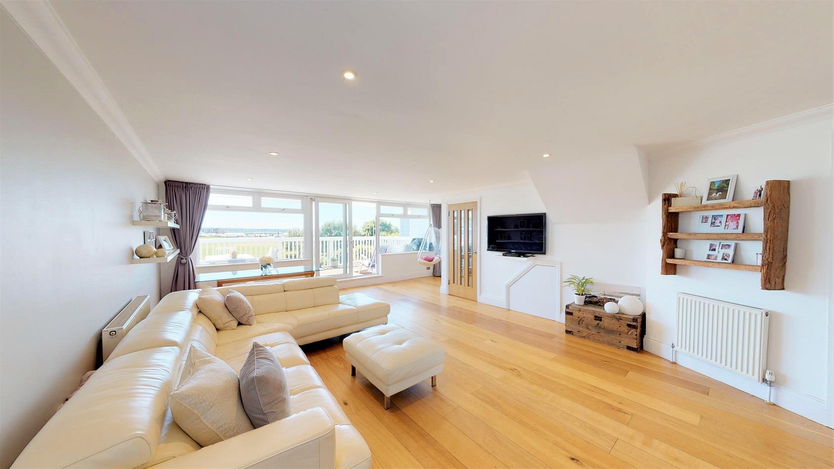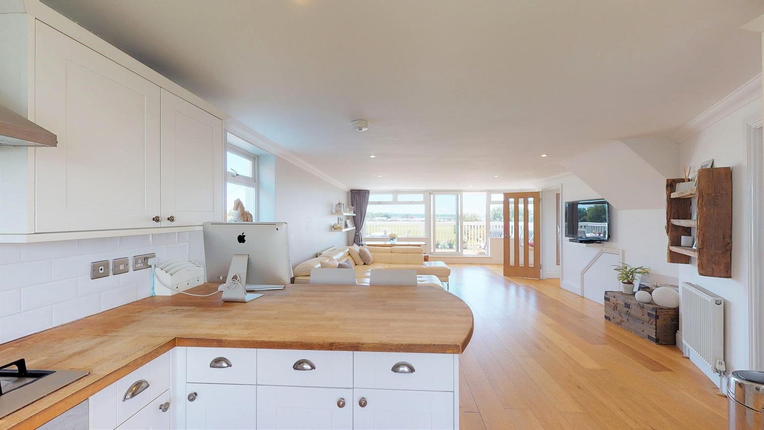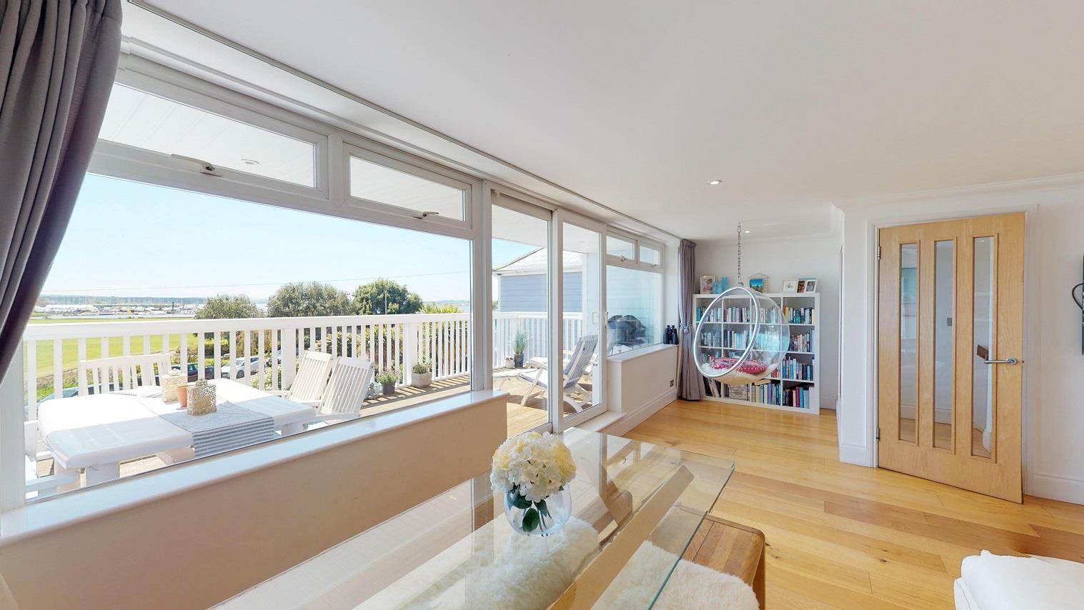 The open plan kitchen/lounge/diner has, in our opinion, the ‘Wow factor’ with its breathtaking far reaching views across Harbourside Park, Poole Harbour, Brownsea Island and the Purbeck Hills beyond. There is an impressive south facing decked sun terrace (22'10 x 10'11) which is large enough to BBQ, dine and relax on. The sun terrace is a real sun trap being sheltered from the wind and open to the sun from dawn to dusk. This area is accessed via double opening patio doors with glass panels either side extending the whole width of the room. The Shaker style kitchen has a range of appliances including an American fridge/freezer. There is an additional room off the living area that is currently used as a snug but could be utilised as either a double bedroom / second lounge, playroom, office or cinema with a door leading to cloakroom/wc.