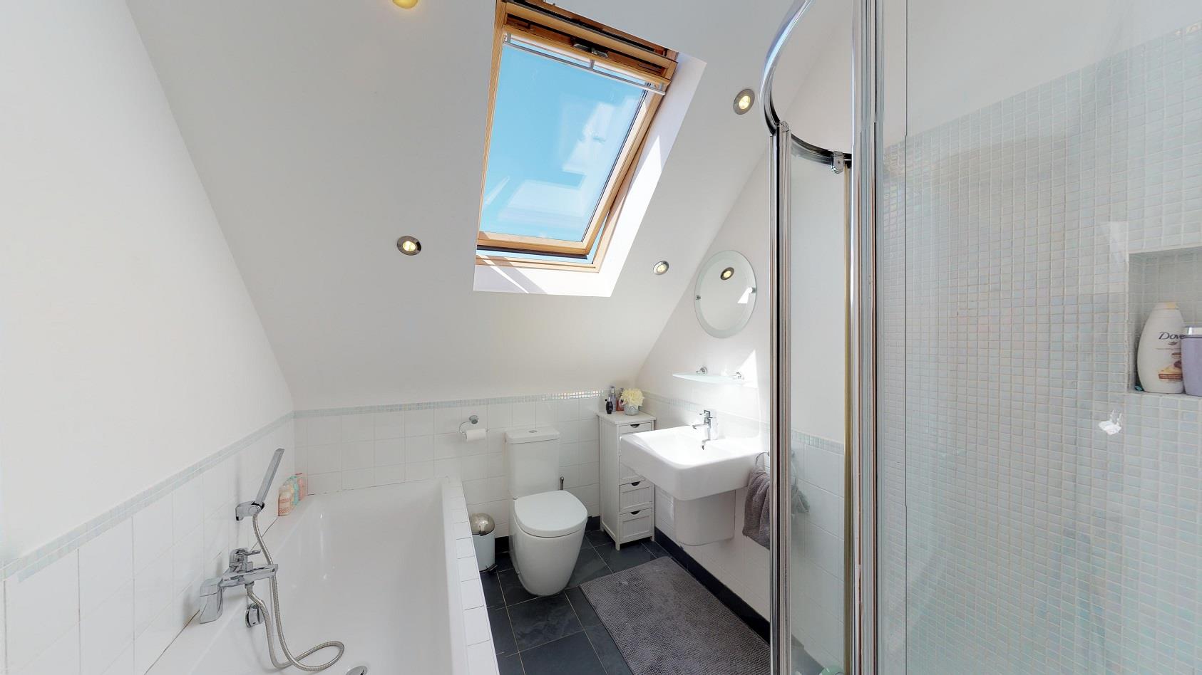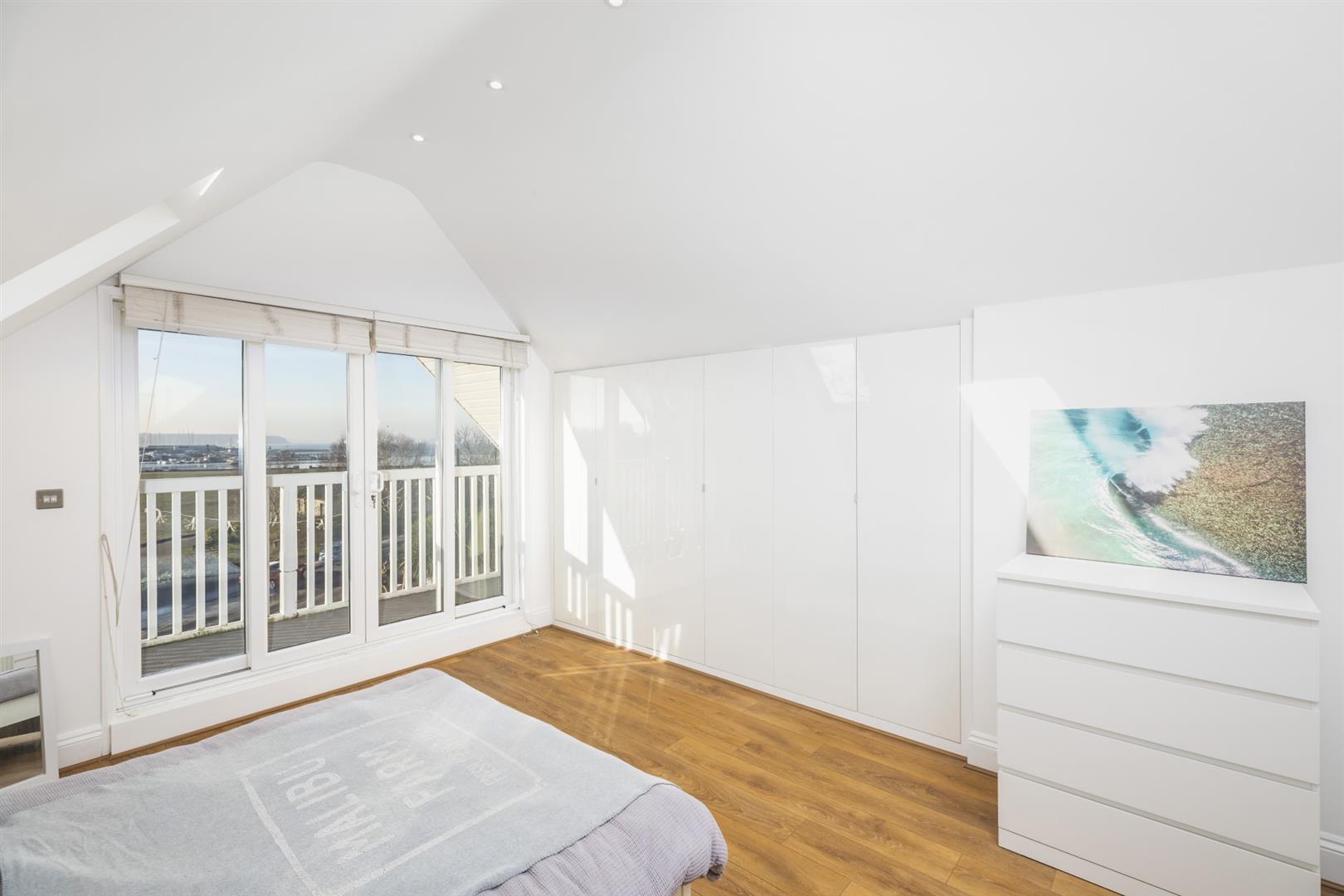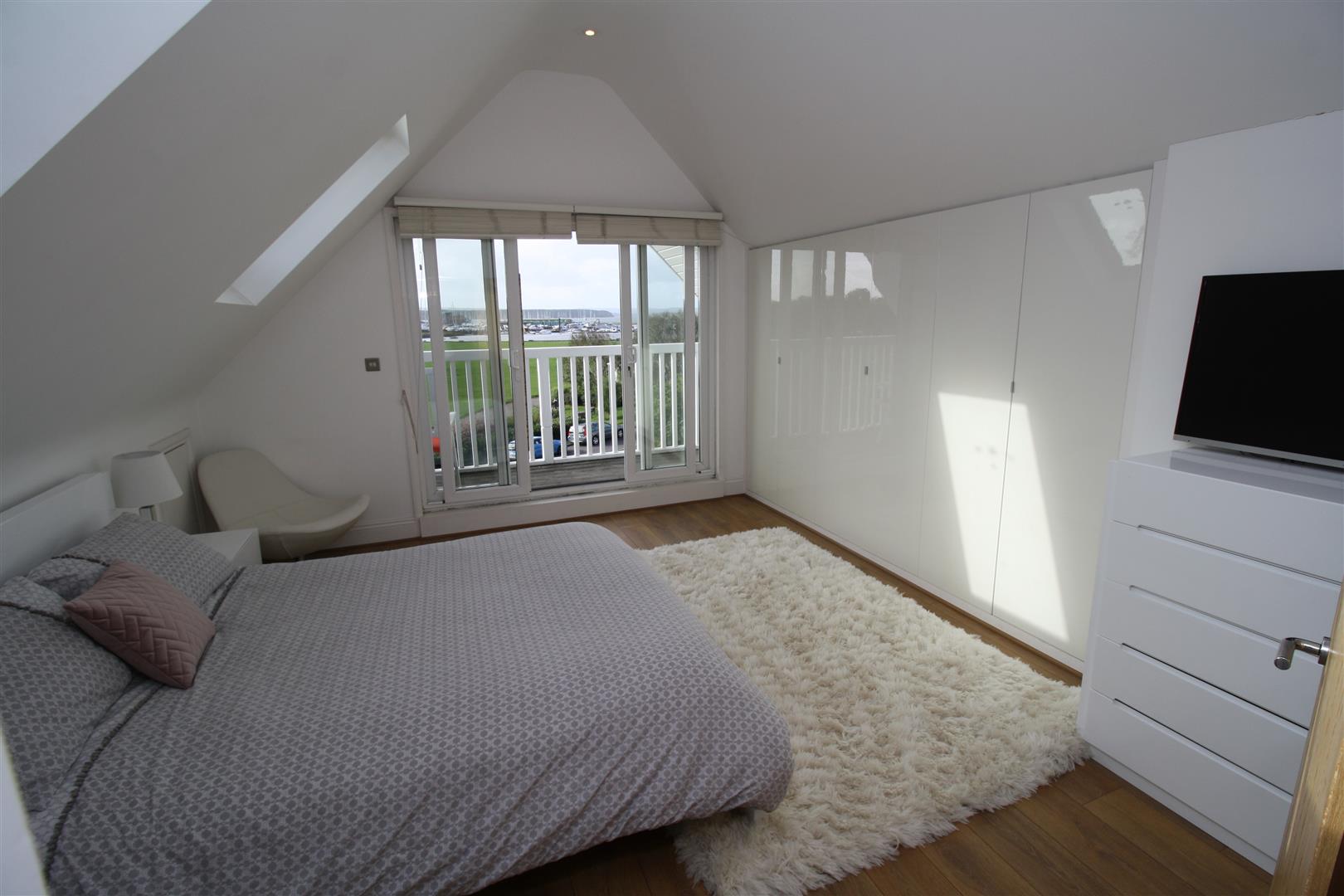 There is a large floor to ceiling walk in storage area with double opening doors. There are two double bedrooms on this floor, the impressive master bedroom is of a good size with an extensive range of floor to ceiling built in wardrobes and additional eaves storage. There are double opening French doors that lead onto a south facing sun terrace, again benefiting from stunning uninterrupted and far reaching views across Harbourside Park, Poole Harbour, Brownsea Island and the Purbeck Hills beyond, remote controlled Velux windows. There is a contemporary family bathroom on this floor.