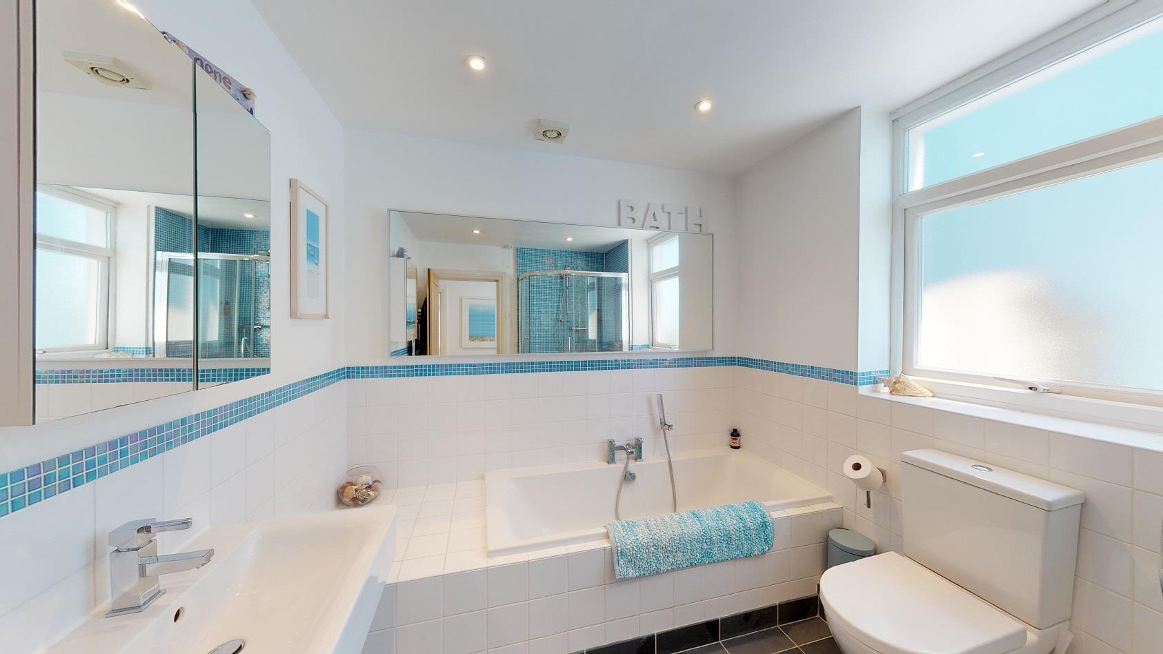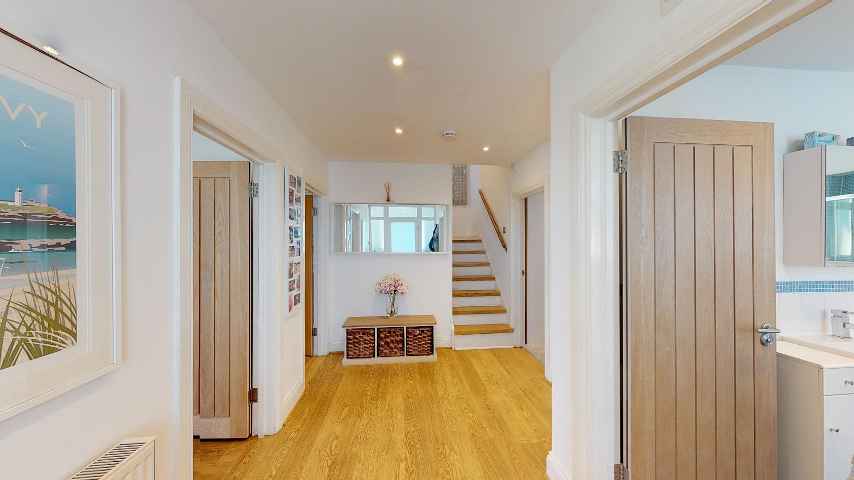 The entrance hallway is bright and inviting. There are three double bedrooms all with sufficient wardrobes/storage. The two front bedrooms are both bright and airy benefiting from their own terrace and harbour glimpses (one with a WC). There is a modern family bathroom, a large walk in airing cupboard ideal for drying wet-suits/ sportswear and storing linen etc and a utility room. The rear garden can be accessed from the ground floor.