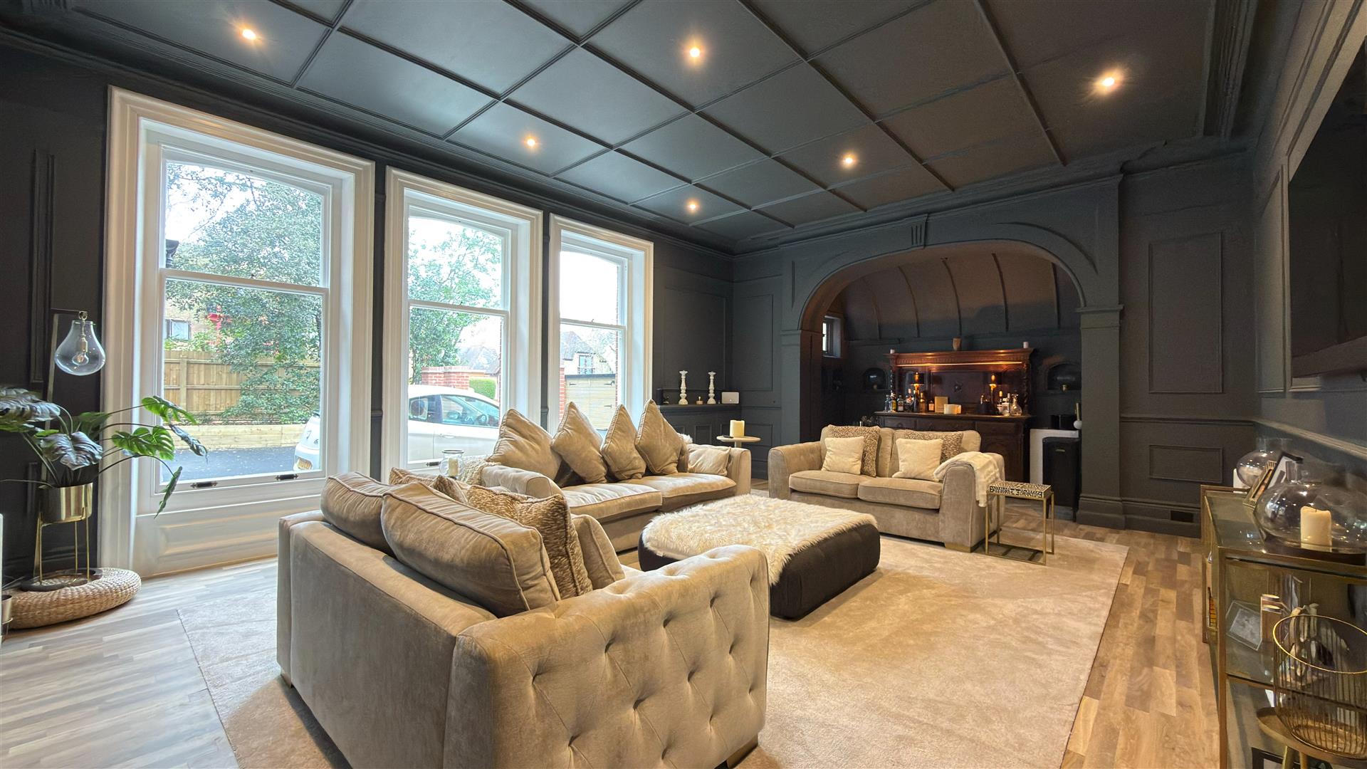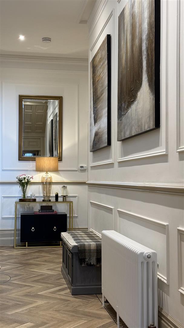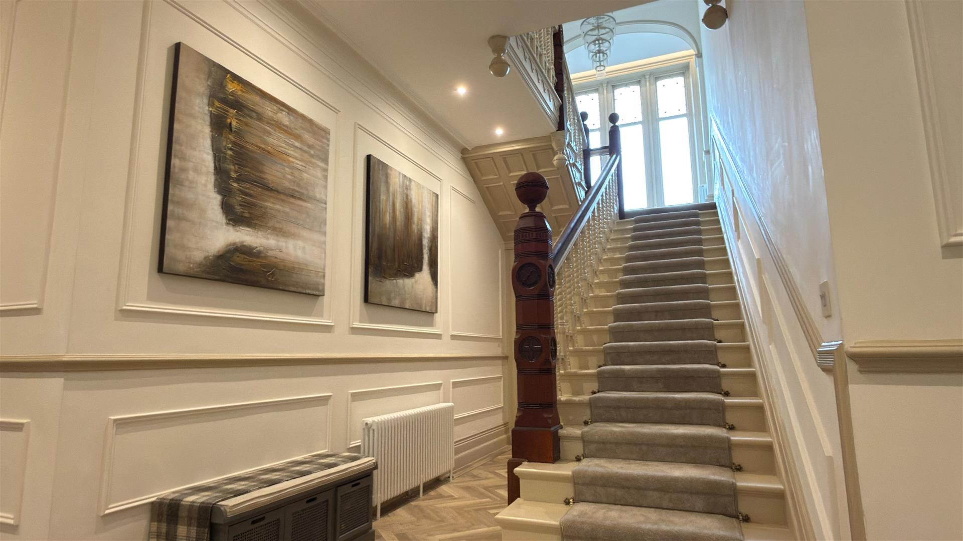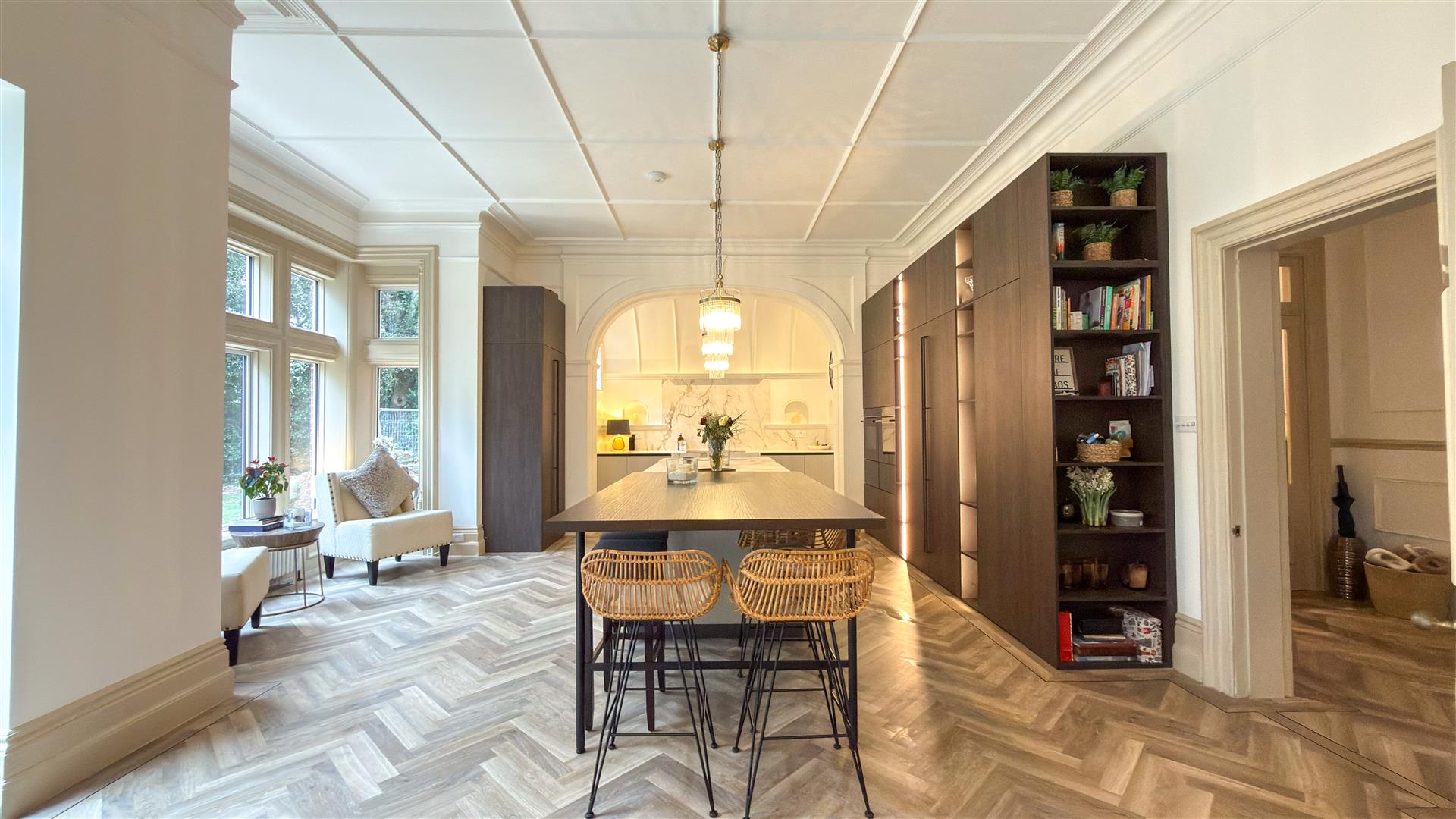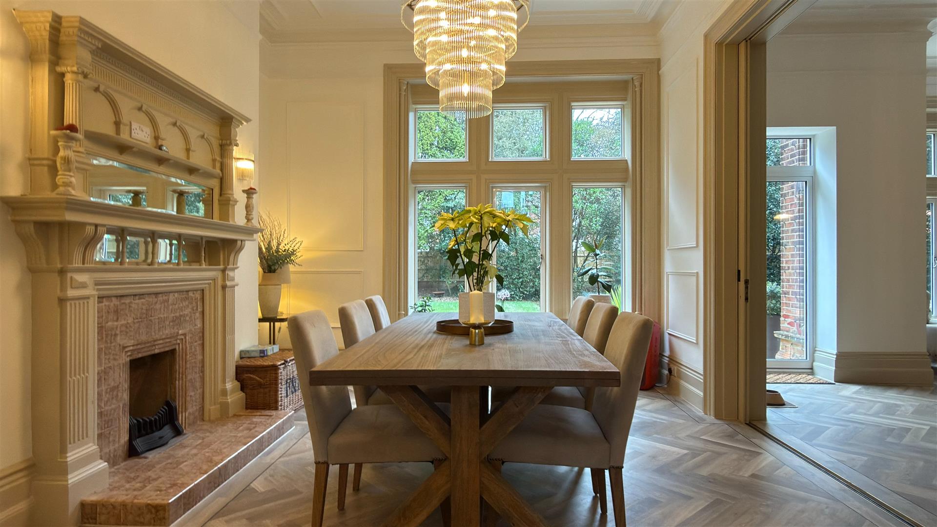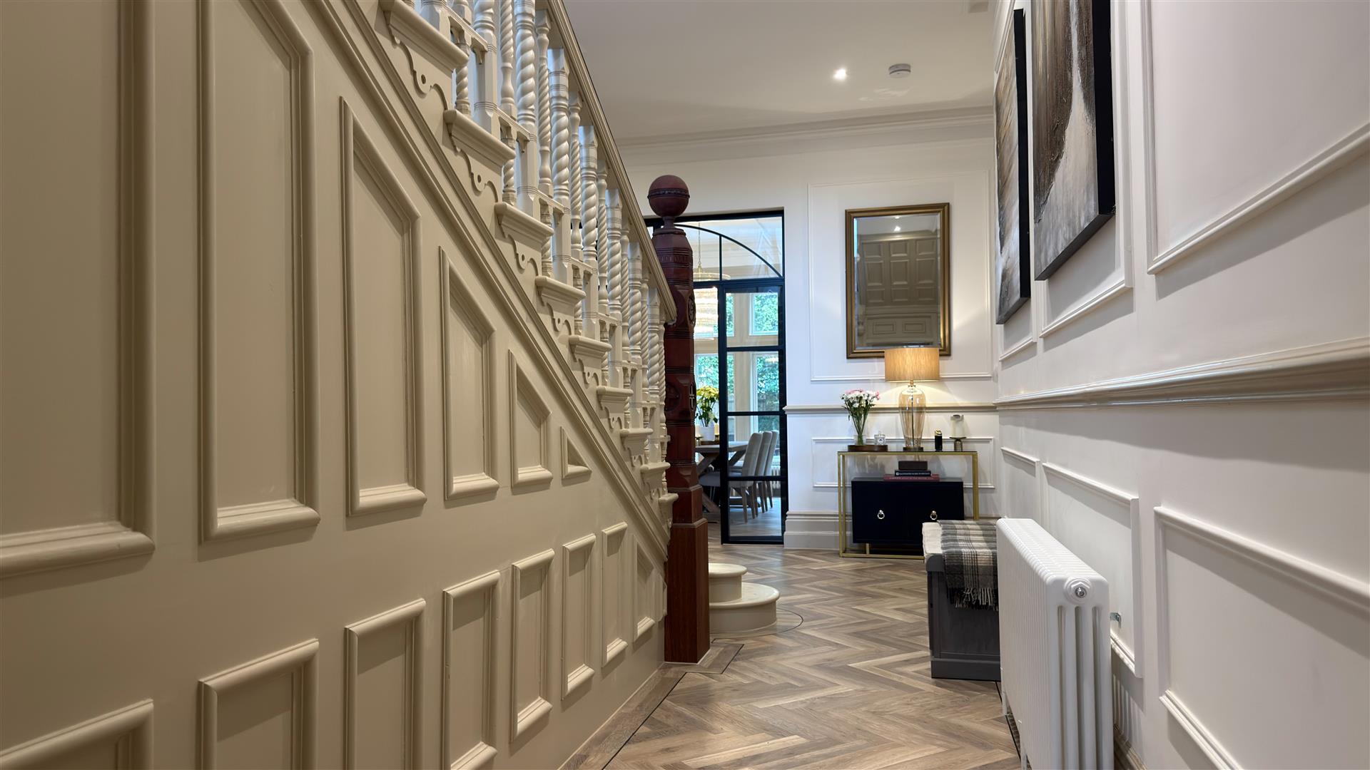 The refurbishment of the principal house is of an exceptional standard throughout, with the building's original Victorian character carefully preserved and elevated at every turn. The entrance hall makes an immediate impression: full-height wainscoting and panel moulding, herringbone parquet underfoot, and the original carved staircase rising ahead with its barley-twist spindles, ornate scroll brackets and polished mahogany newel post. The principal reception room is vast — coffered plaster ceilings, deep cornice, a crystal chandelier and a broad garden-facing bay window and opens through to a sun-drenched sitting room enclosed by floor-to-ceiling glazing on three sides.