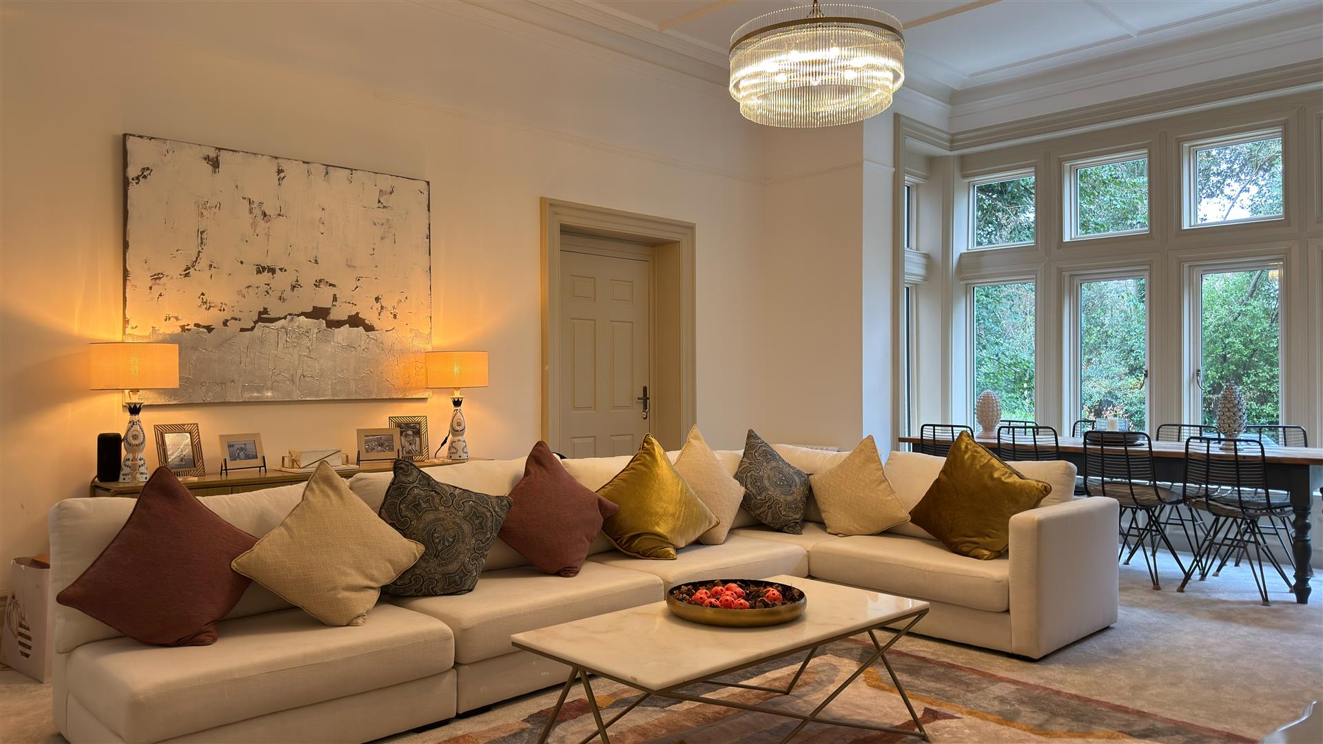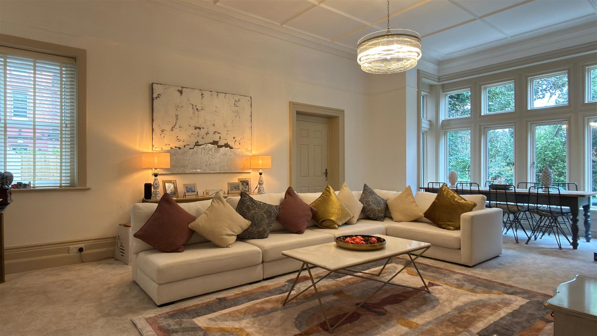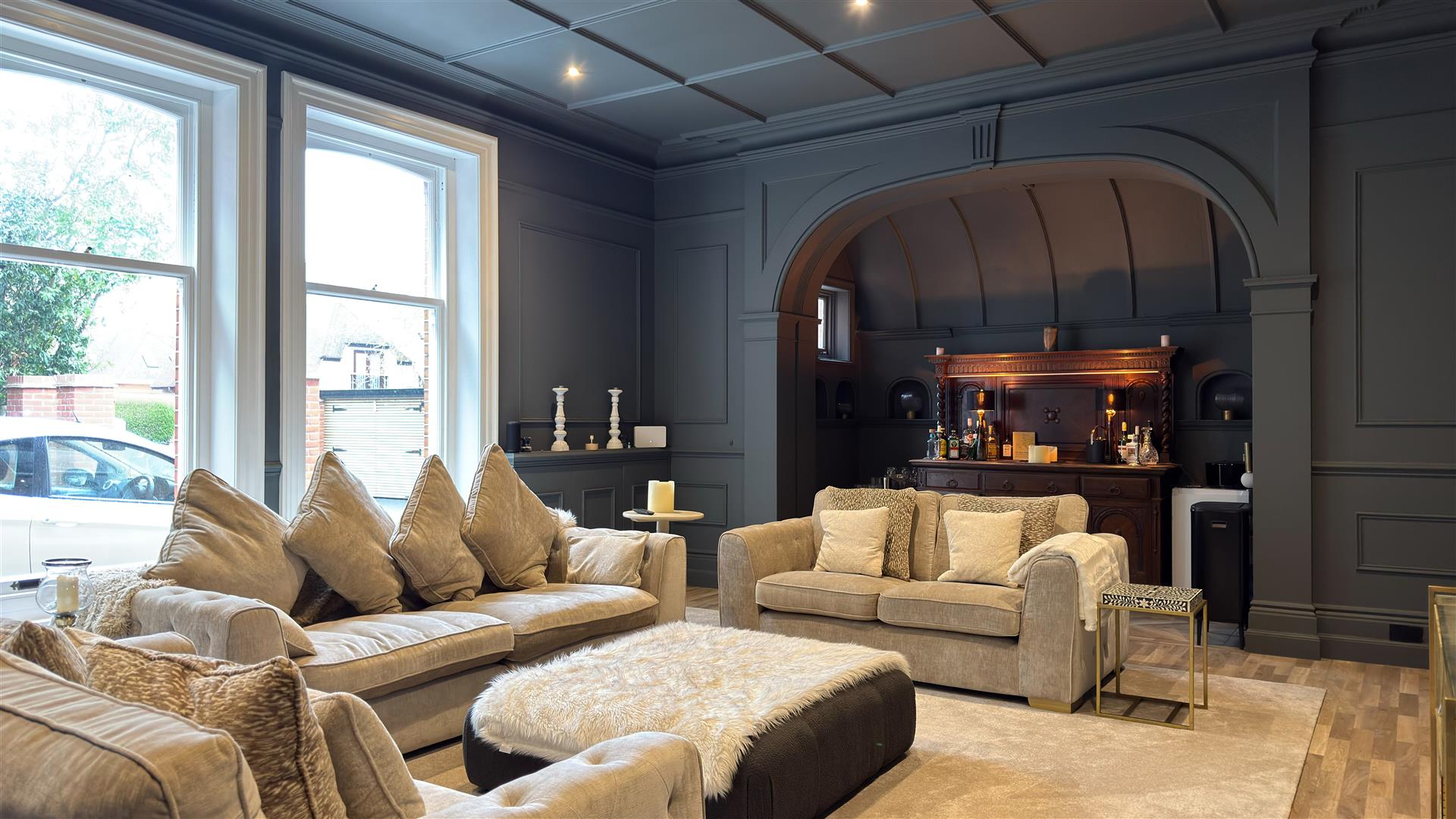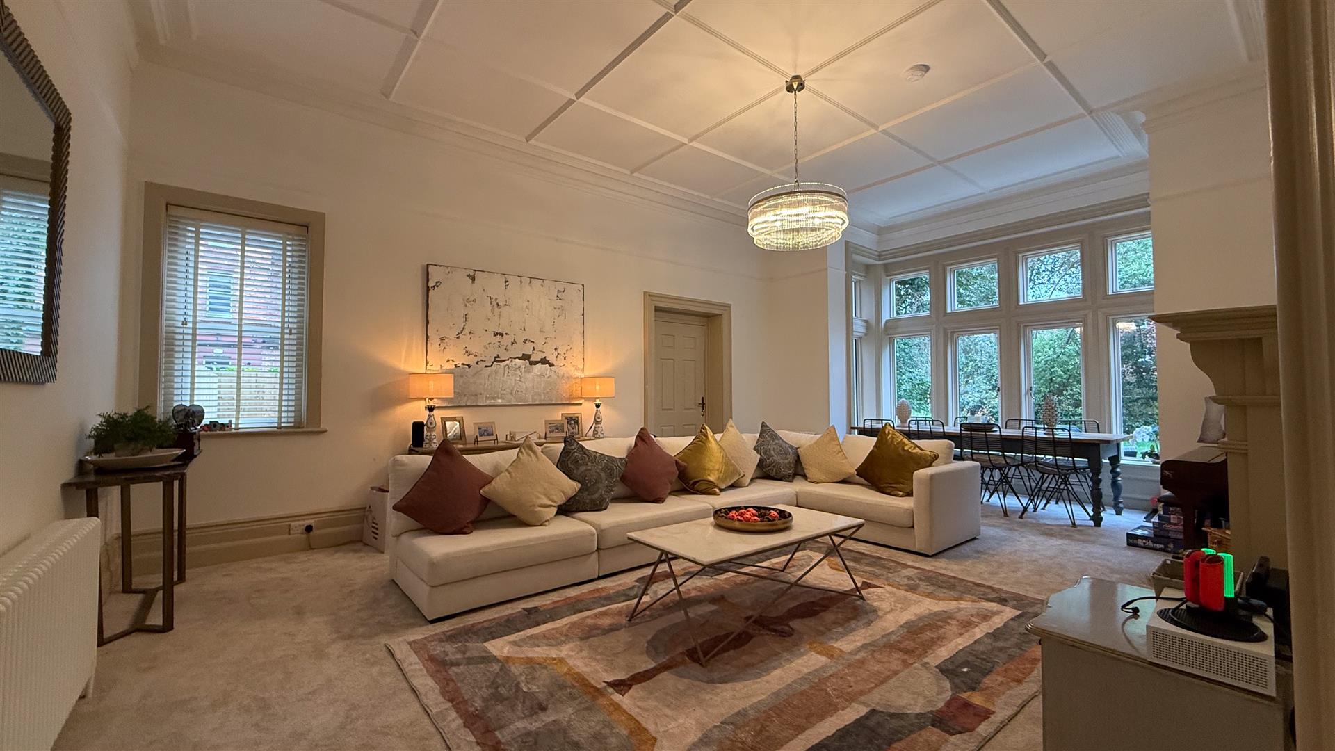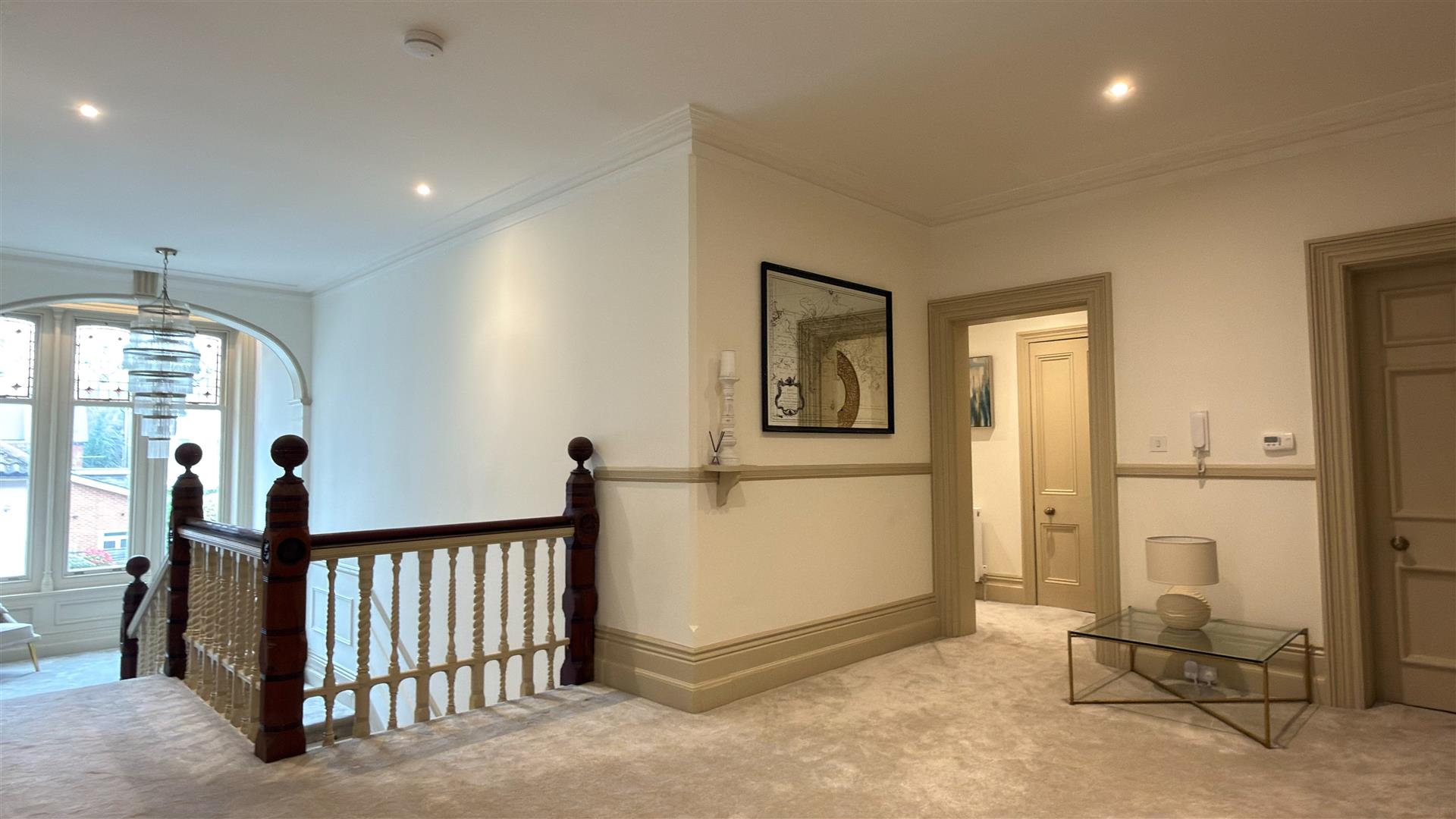 The refurbishment of the principal house is of an exceptional standard throughout, with the building's original Victorian character carefully preserved and elevated at every turn. The entrance hall makes an immediate impression: full-height wainscoting and panel moulding, herringbone parquet underfoot, and the original carved staircase rising ahead with its barley-twist spindles, ornate scroll brackets and polished mahogany newel post. The principal reception room is vast — coffered plaster ceilings, deep cornice, a crystal chandelier and a broad garden-facing bay window and opens through to a sun-drenched sitting room enclosed by floor-to-ceiling glazing on three sides.