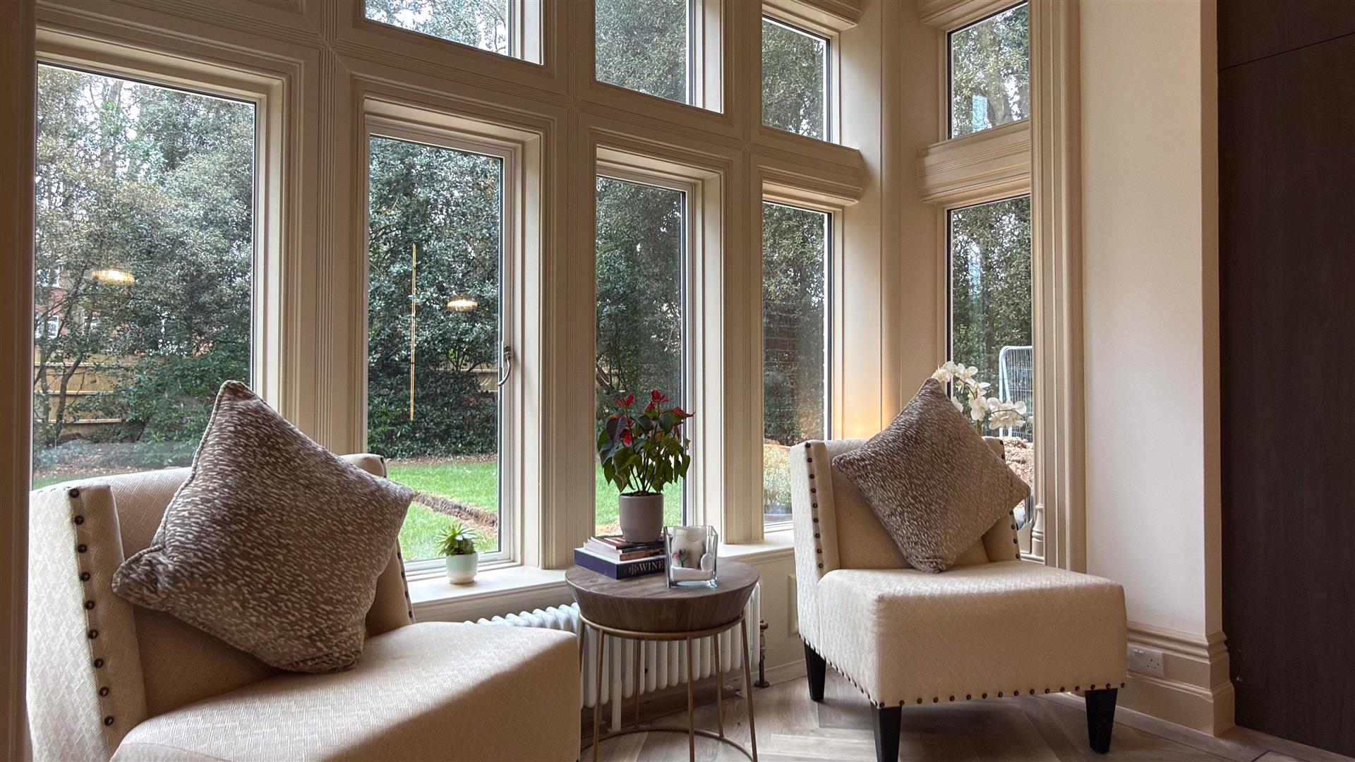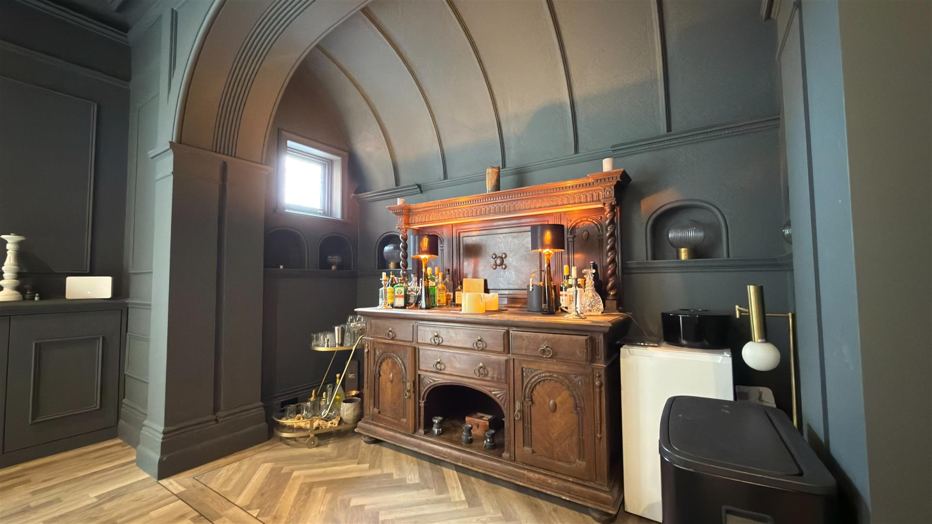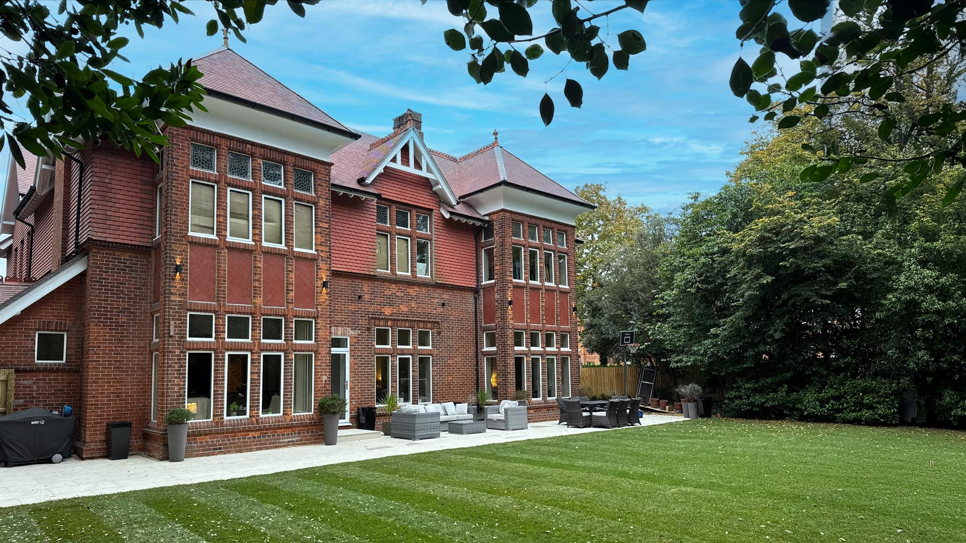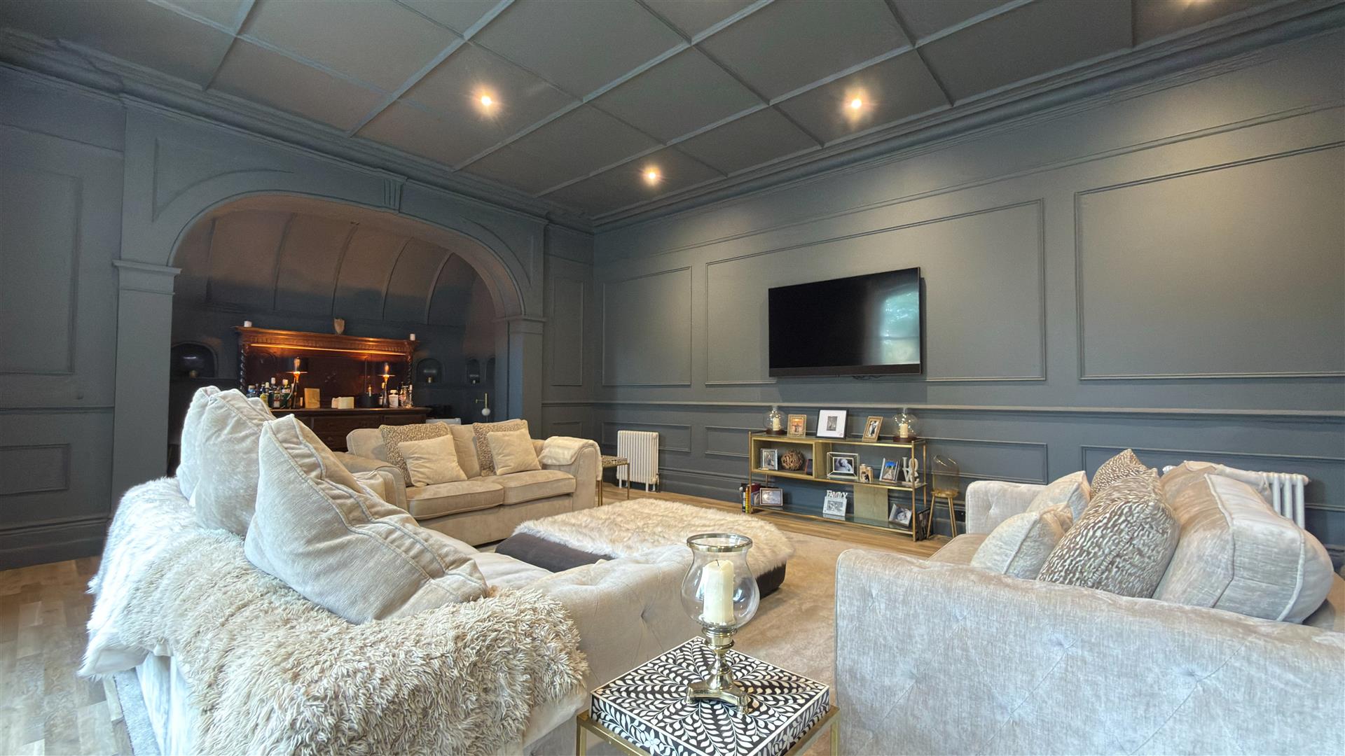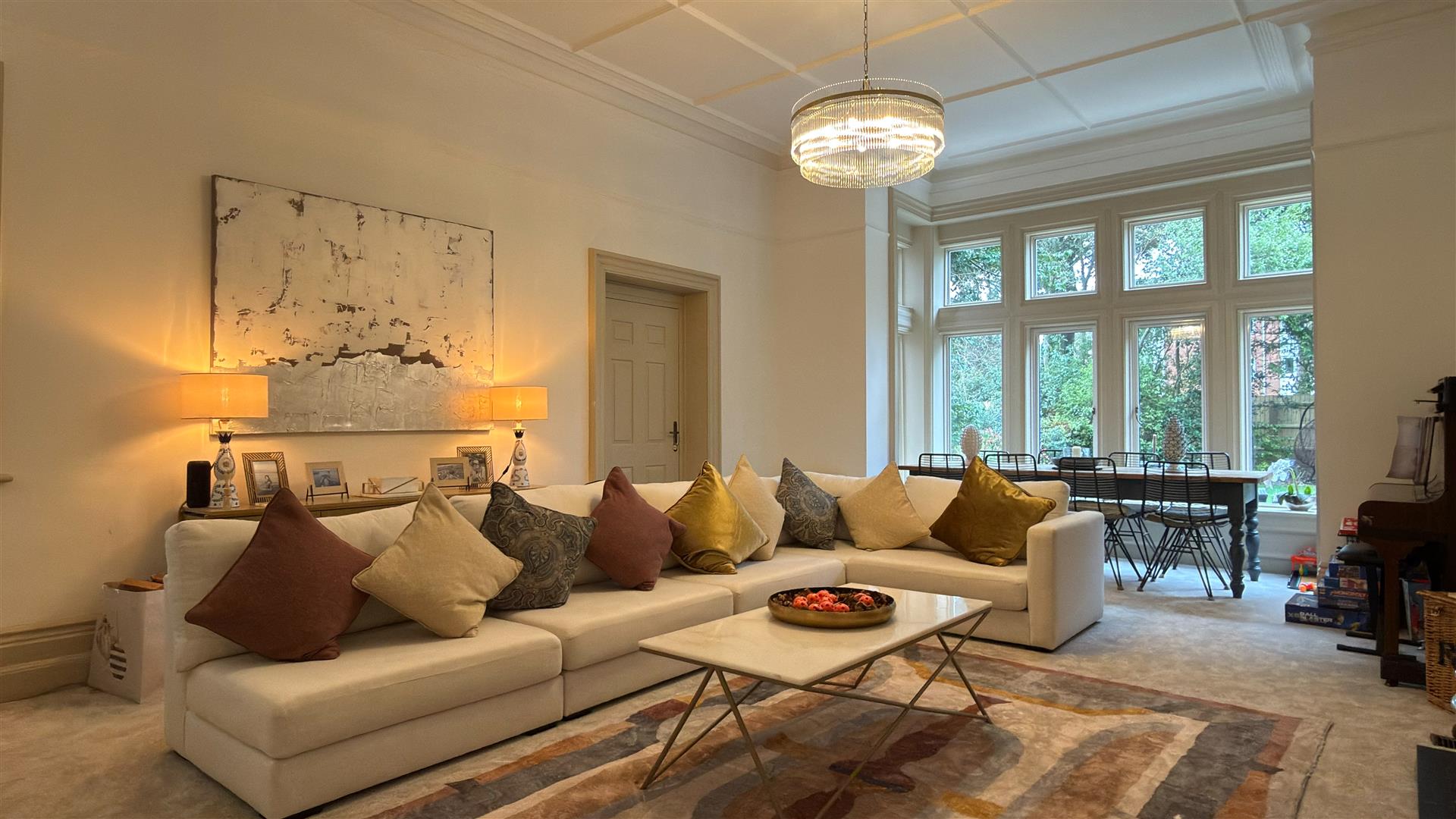 The refurbishment of the principal house is of an exceptional standard throughout, with the building's original Victorian character carefully preserved and elevated at every turn. The entrance hall makes an immediate impression: full-height wainscoting and panel moulding, herringbone parquet underfoot, and the original carved staircase rising ahead with its barley-twist spindles, ornate scroll brackets and polished mahogany newel post. The principal reception room is vast — coffered plaster ceilings, deep cornice, a crystal chandelier and a broad garden-facing bay window and opens through to a sun-drenched sitting room enclosed by floor-to-ceiling glazing on three sides.