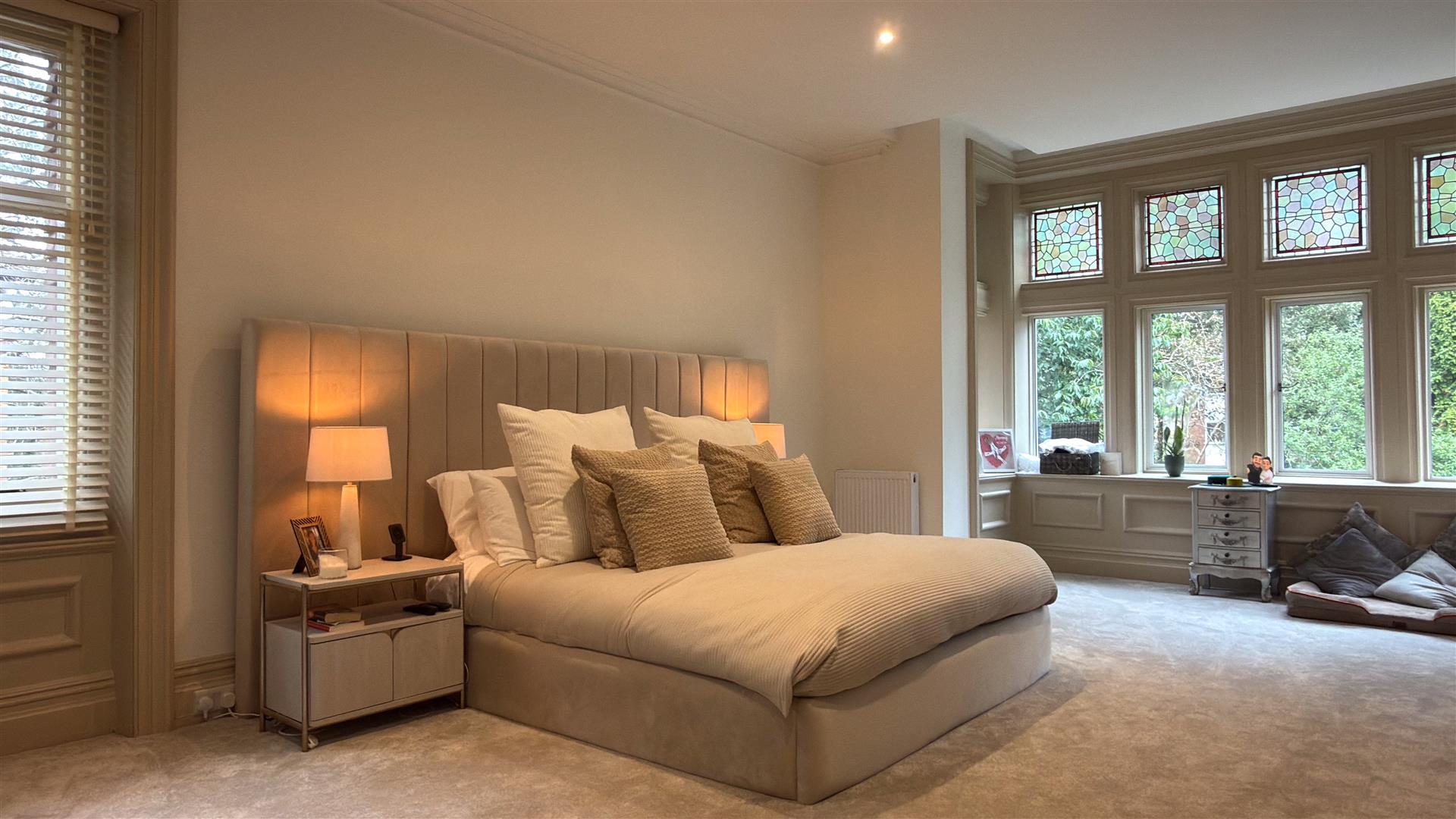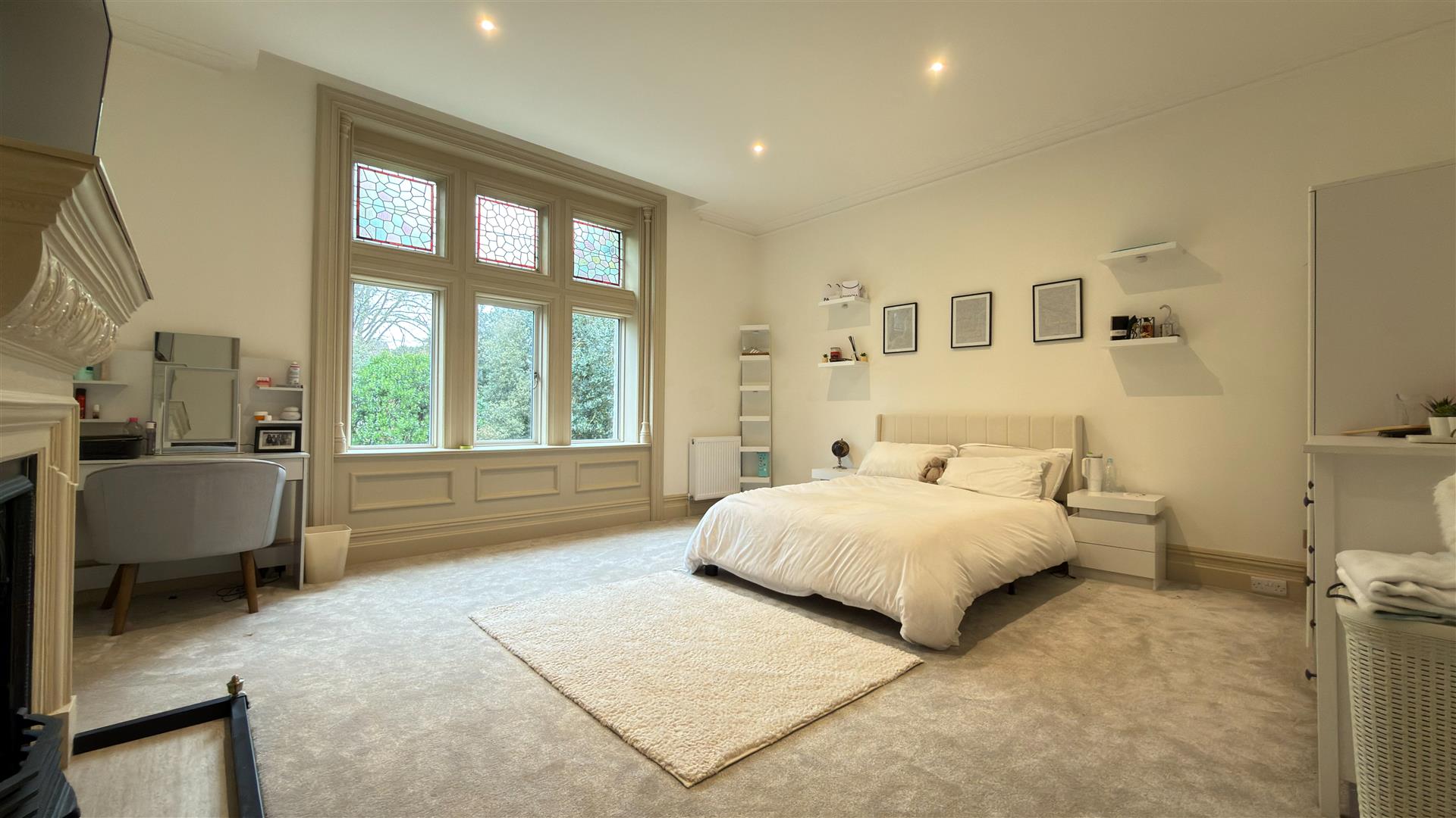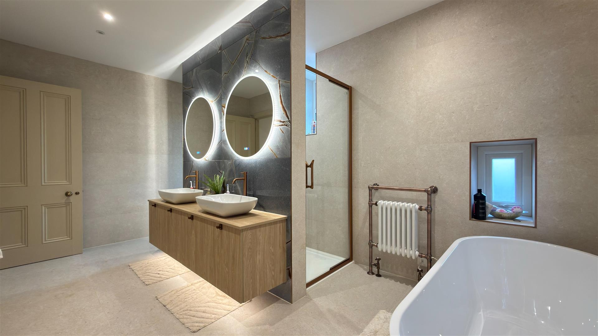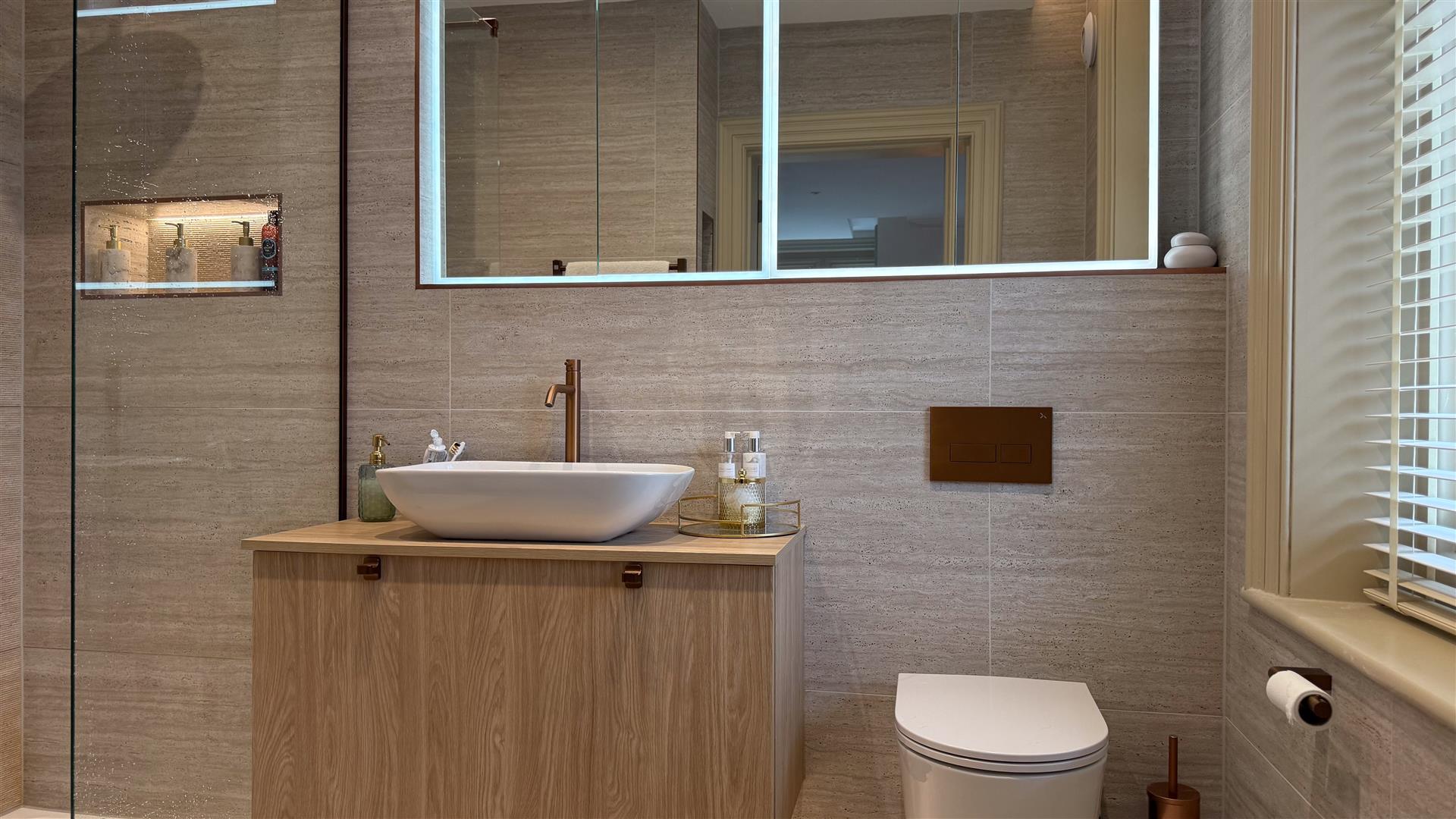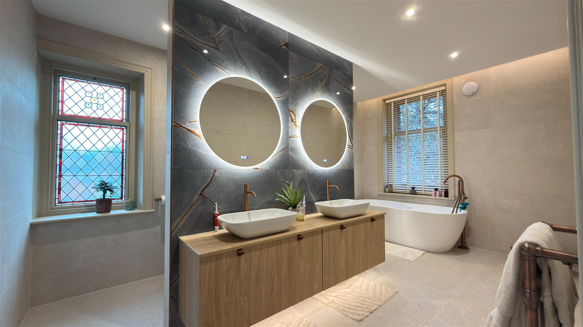 Five generous bedrooms include a principal suite of excellent proportions with stained glass upper window lights and a spa-quality en-suite: twin vessel basins, freestanding bath, walk-in glass shower and a dramatic dark marble feature wall. A second beautifully appointed bathroom — travertine stone tiling, rainfall shower and copper-finish fixtures serves the remaining rooms. Several further bedrooms retain original period fireplace surrounds.