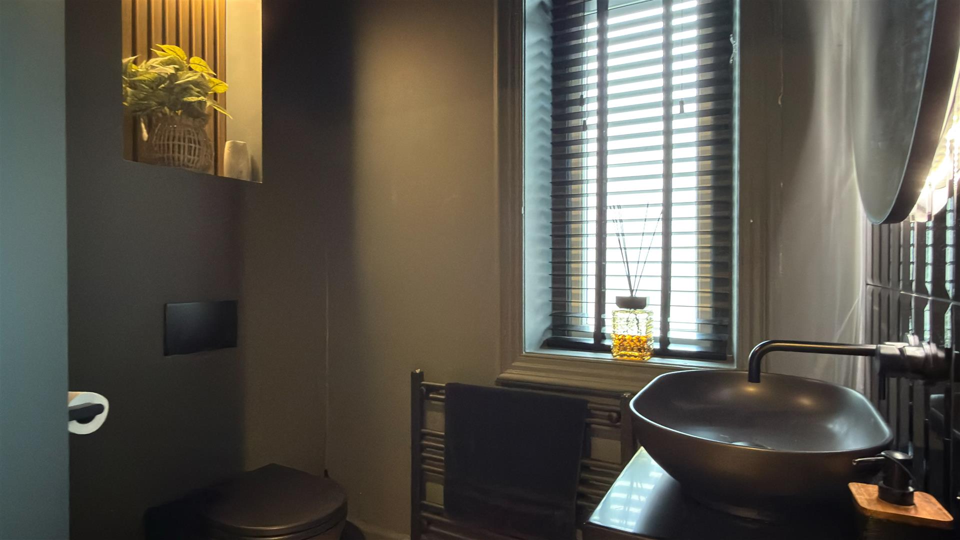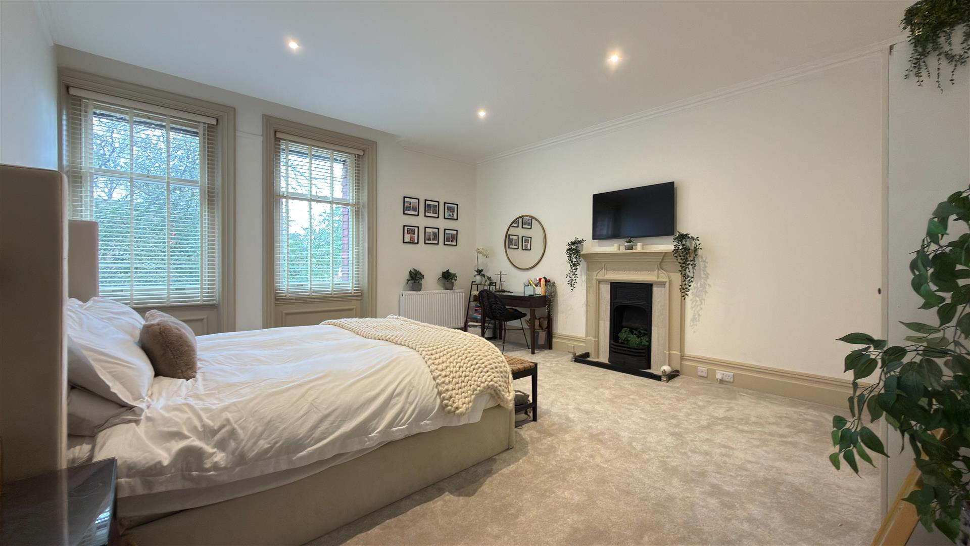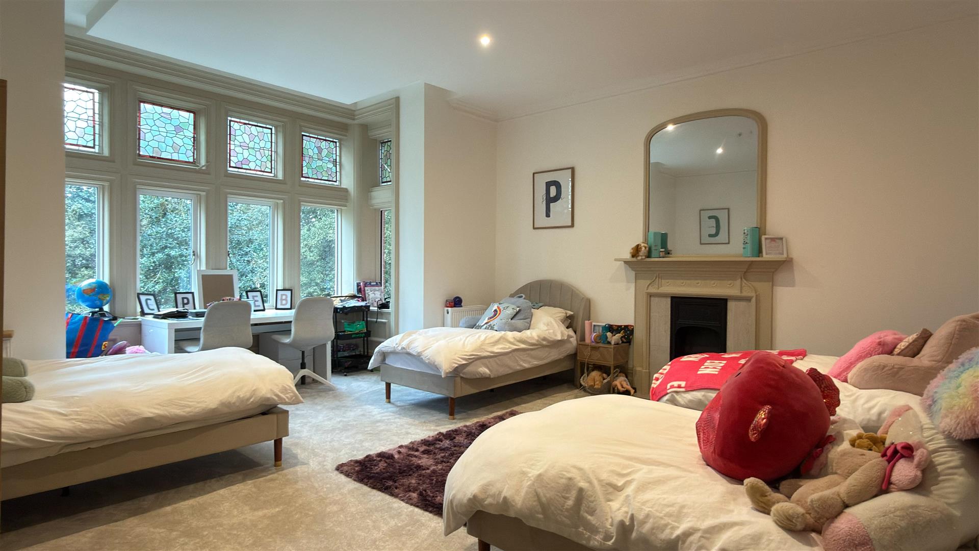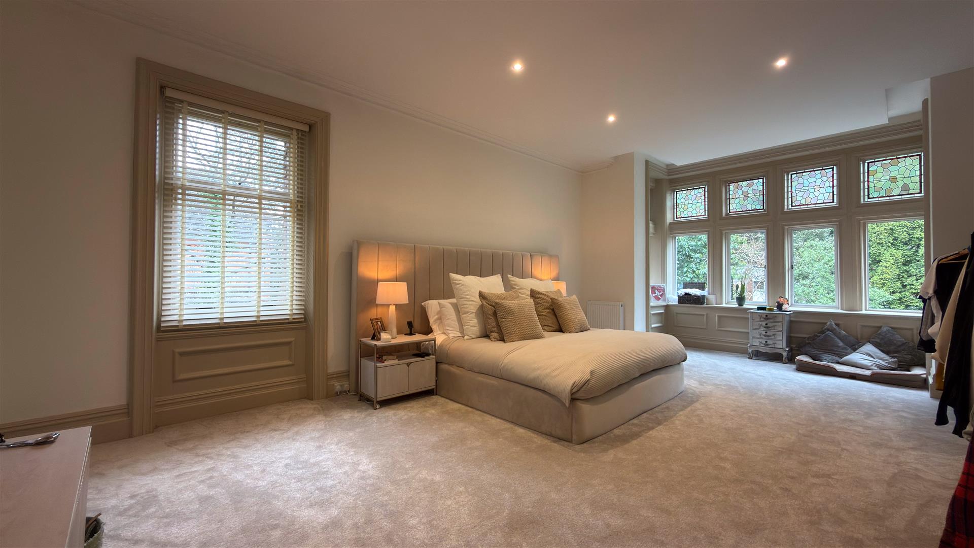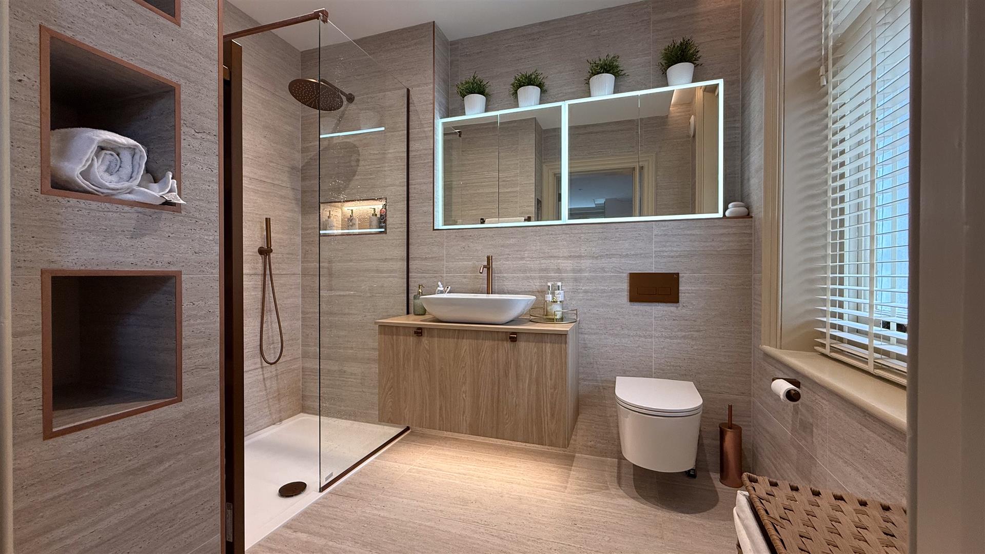 Five generous bedrooms include a principal suite of excellent proportions with stained glass upper window lights and a spa-quality en-suite: twin vessel basins, freestanding bath, walk-in glass shower and a dramatic dark marble feature wall. A second beautifully appointed bathroom — travertine stone tiling, rainfall shower and copper-finish fixtures serves the remaining rooms. Several further bedrooms retain original period fireplace surrounds.