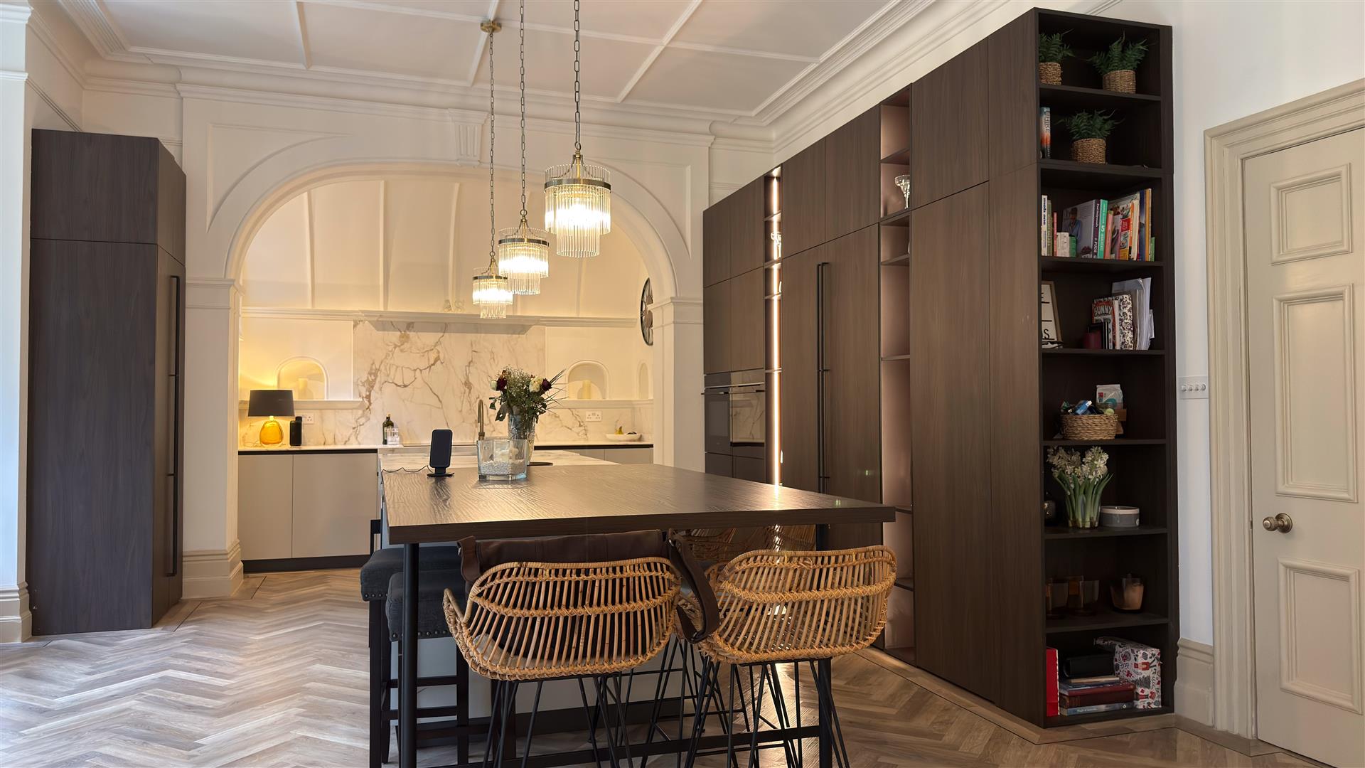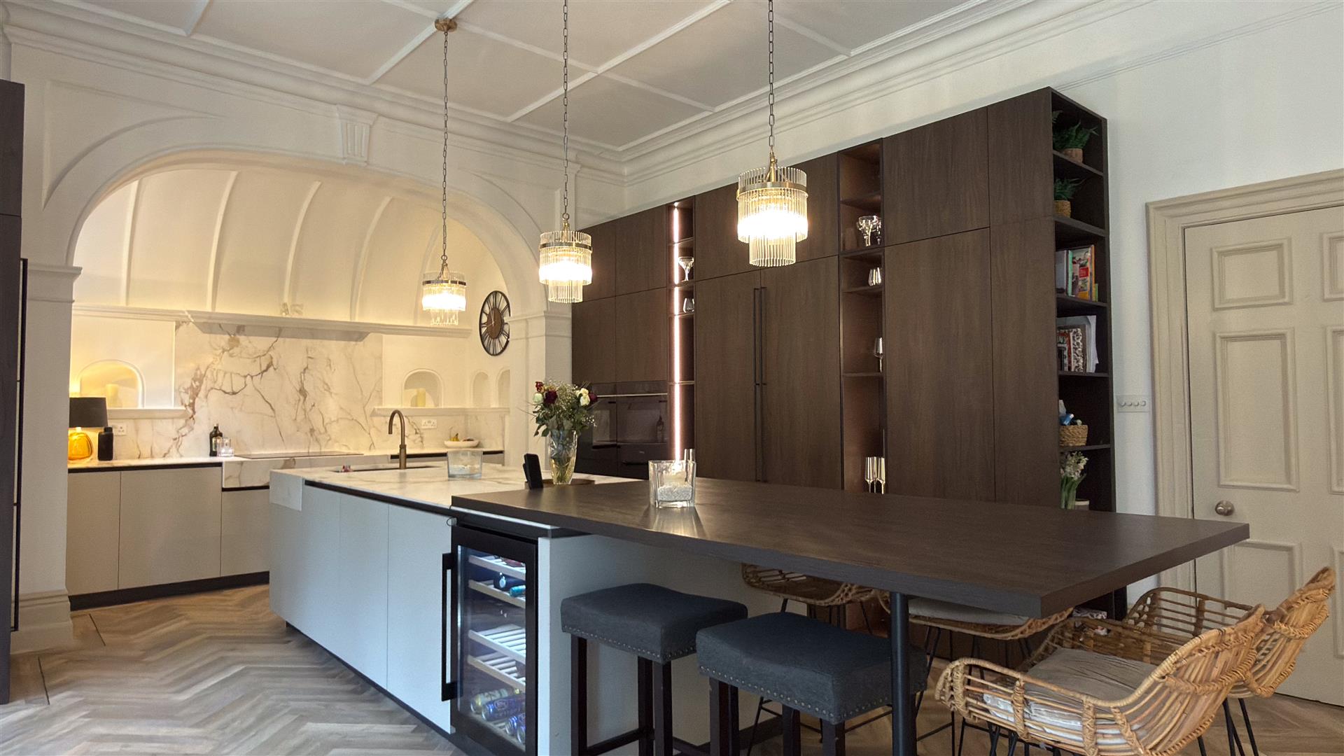 The open-plan kitchen and dining space is the standout room of the house. A grand Victorian arched alcove forms a dramatic backdrop to the kitchen, finished in pale grey cabinetry with a full-height Calacatta marble splashback and a large marble-topped island. A smoked dark oak cabinet tower with integrated lighting and open shelving divides the space, and a bar-height counter with wine fridge completes an interior designed as much for entertaining as for everyday living.